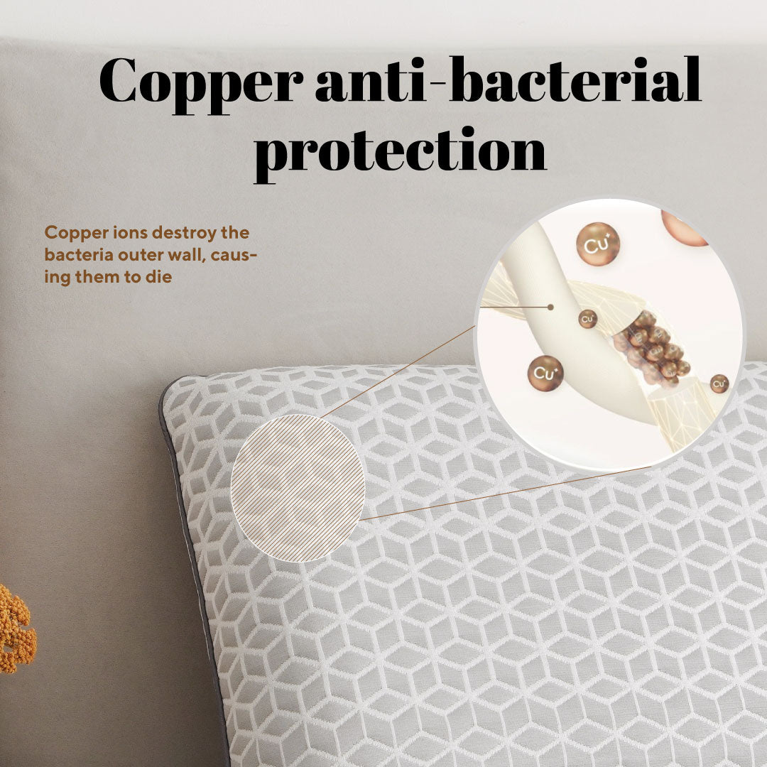 If you struggle with neck and shoulder pain, but find memory foam not comfortable, then this is the pillow for you. This adjustable 4-layer pillow design is made from cooling graphene memory foam and allows you to customise your pillow height & firmness by removing or adding layers – perfect if you are a side sleeper but can also be adjusted to back and front sleepers. Our luxury copper cover will also help with your allergies and keep your hair healthy.