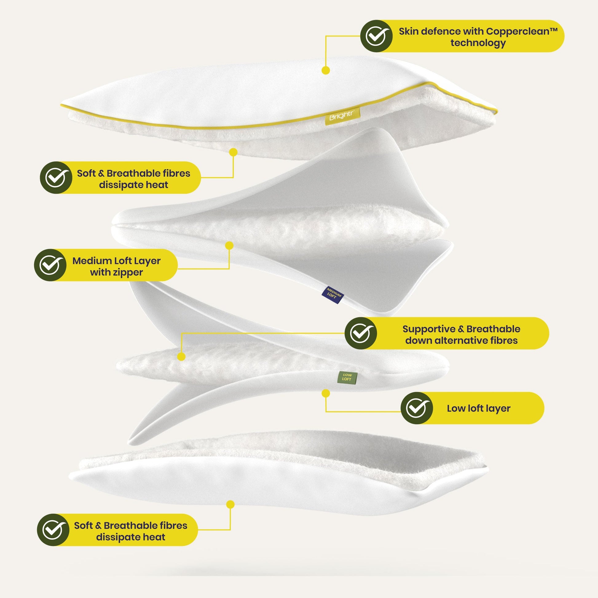 Brightr® Sleep Nox adjustable pillow brings essential comfort for a blissful and refreshing night's sleep. The IQillow™ 2 layer design allows you to adjust pillow height & softness to your liking. The soothing ultra-breathable Refinex™ down alternative pillow filling feels like the most expensive down pillow in the world, without the price tag. Wrapped in our copper pillow cover, you can finally enjoy a more hygienic sleep experience.