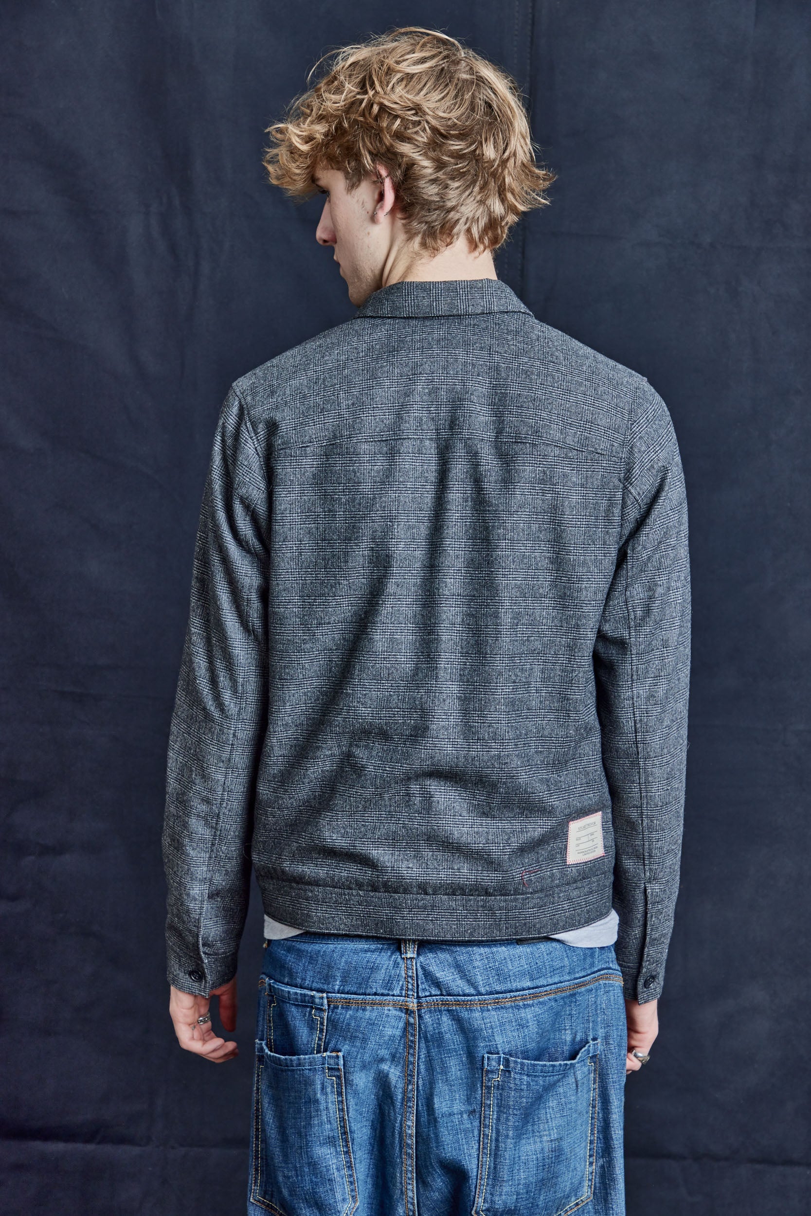 Repuposed checkered 50s style zipper jacket. 100% wool. Featuring double ended zip front, waist side slit pockets, and shirt-style collar.