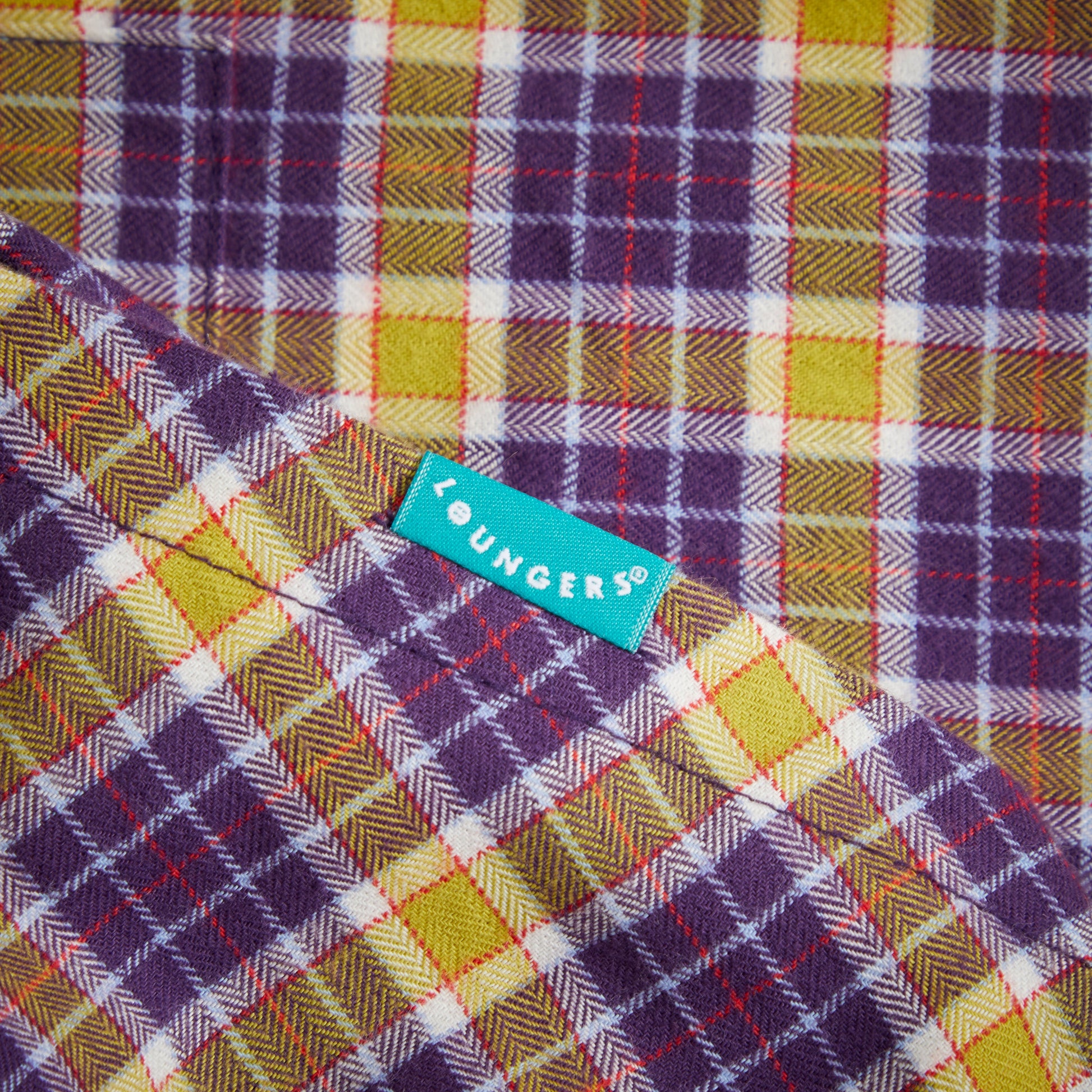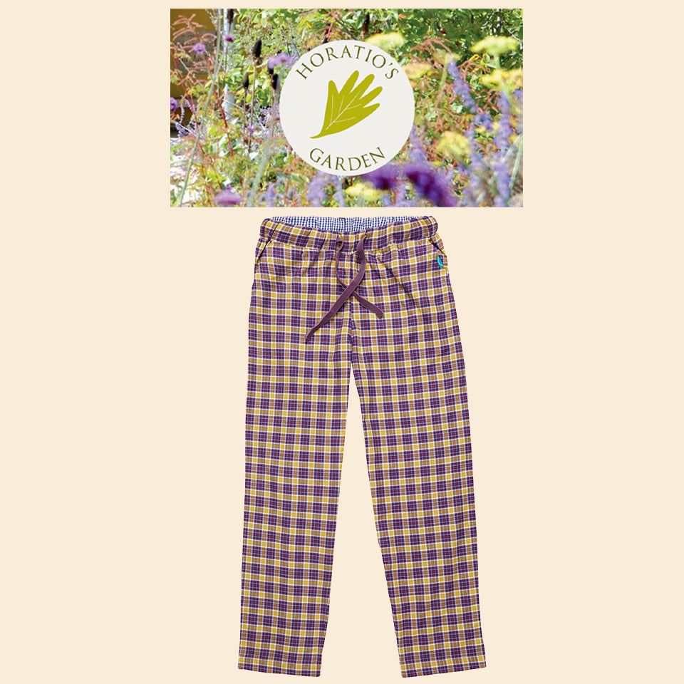 Ethically produced, supremely soft, organic brushed cotton Loungers that combine style, comfort and sustainability. These purple and green check loungers are designed to promote Horatio's Garden and mirror their great colours.