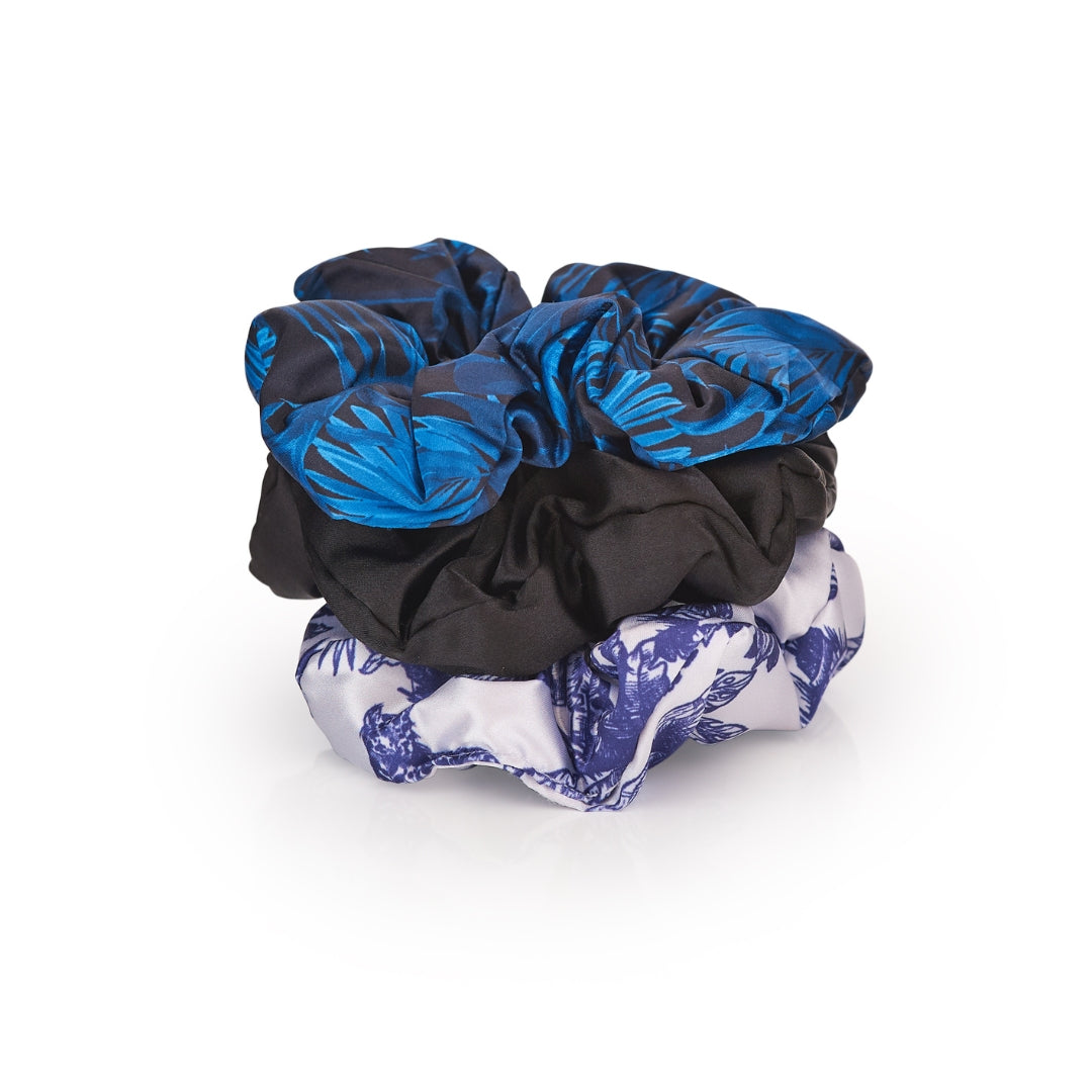 Take your hair game to the wild side with the Cloud Satin Scrunchie Set in Elephant Noir. This striking trio includes one scrunchie in our signature Elephant print (white and navy), one in dramatic Palm Noir (black and blue leaves), and one in classic black satin.