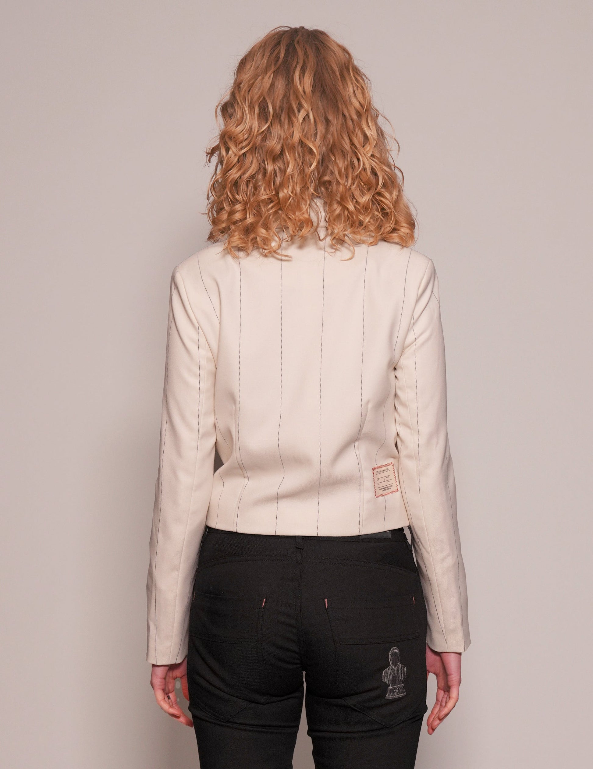 Beautiful Canvas women's Double-breasted cropped blazer. With blue pinstripes, breast pocket and inside button piped pocket. Crafted by 2ndDay.