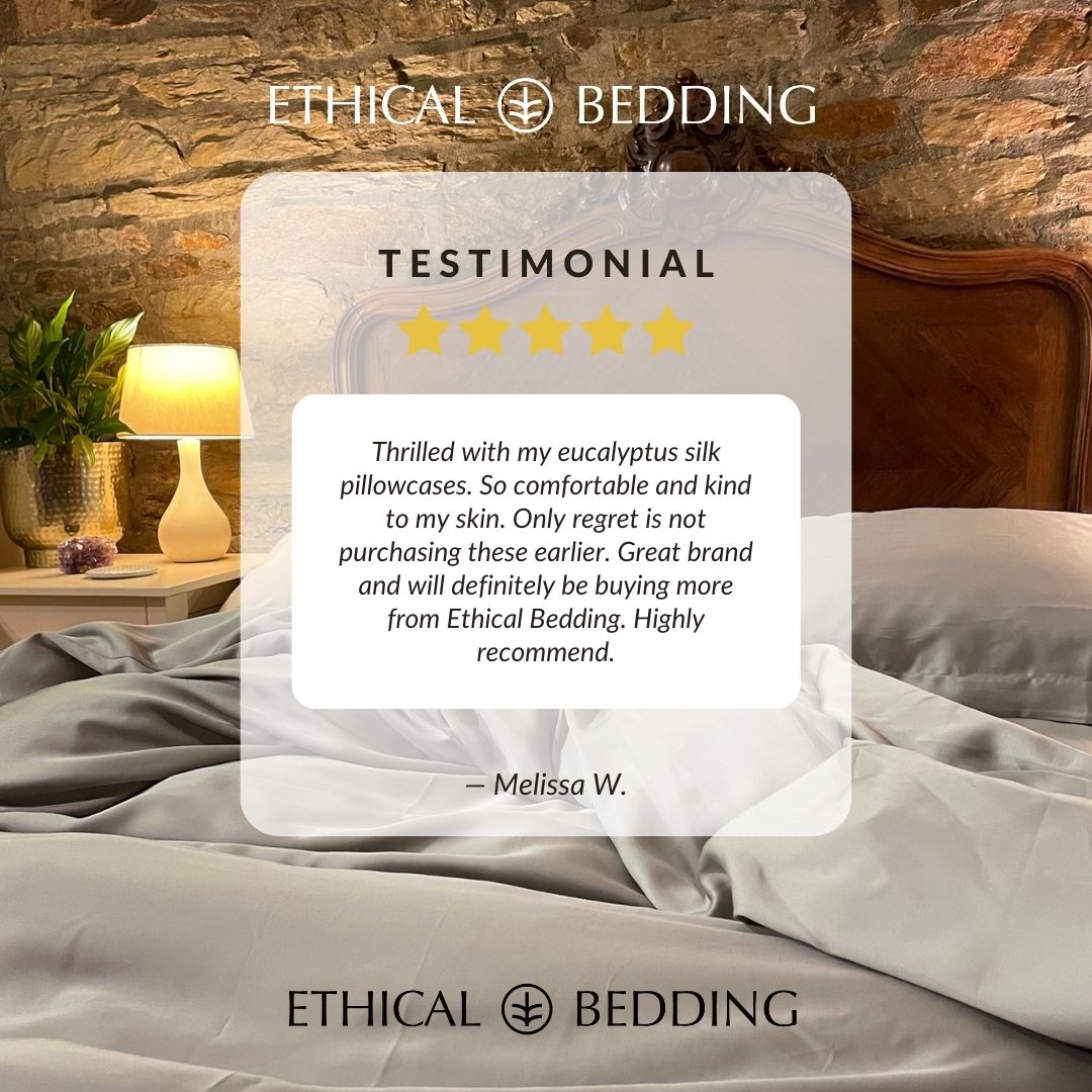 Our fabric is made from eucalyptus that's grown using 95% less water than cotton, no farmable land, and zero herbicides or pesticides. It's naturally hypoallergenic, resistant to bacteria growth and has the same hair, skin and sleep benefits as conventional silk.