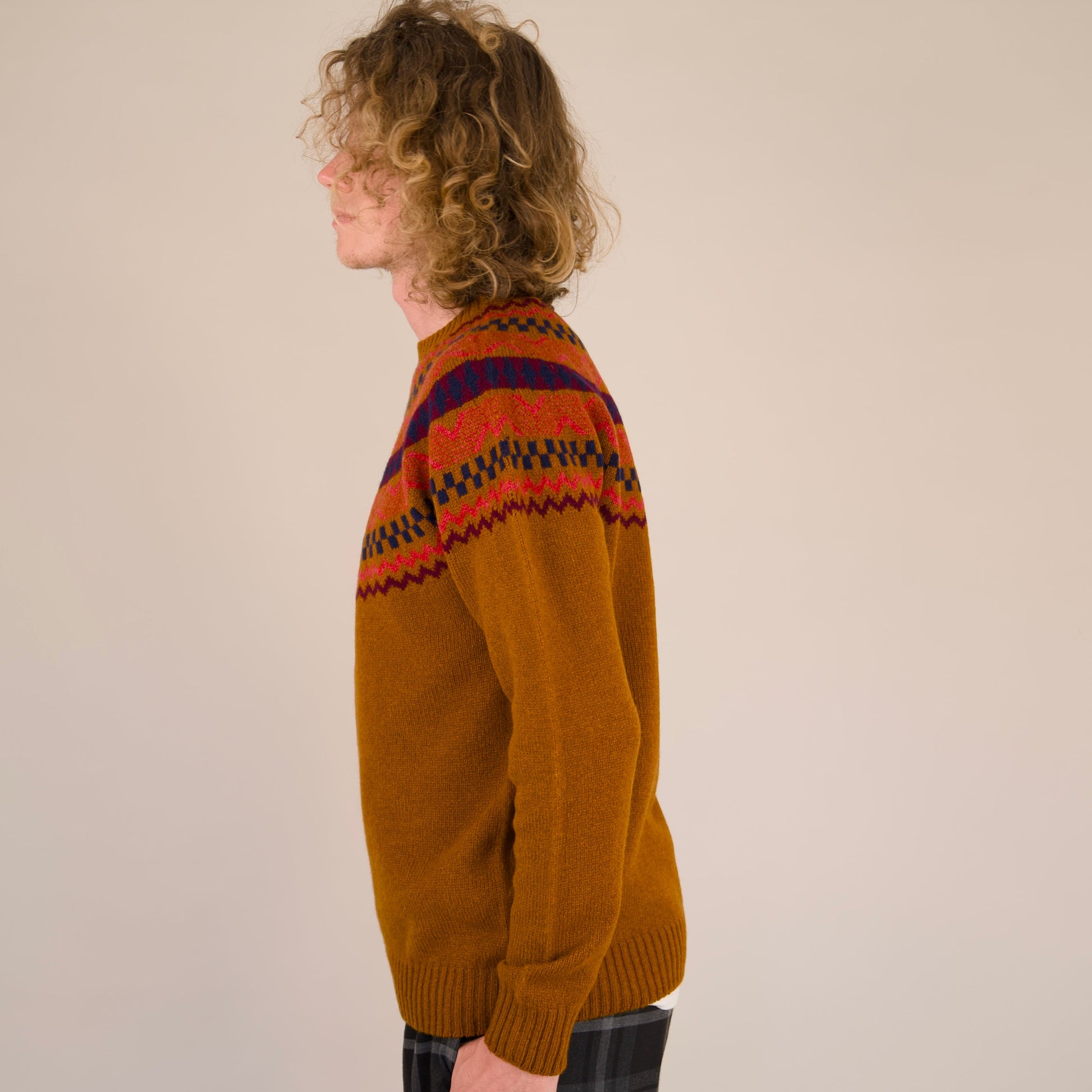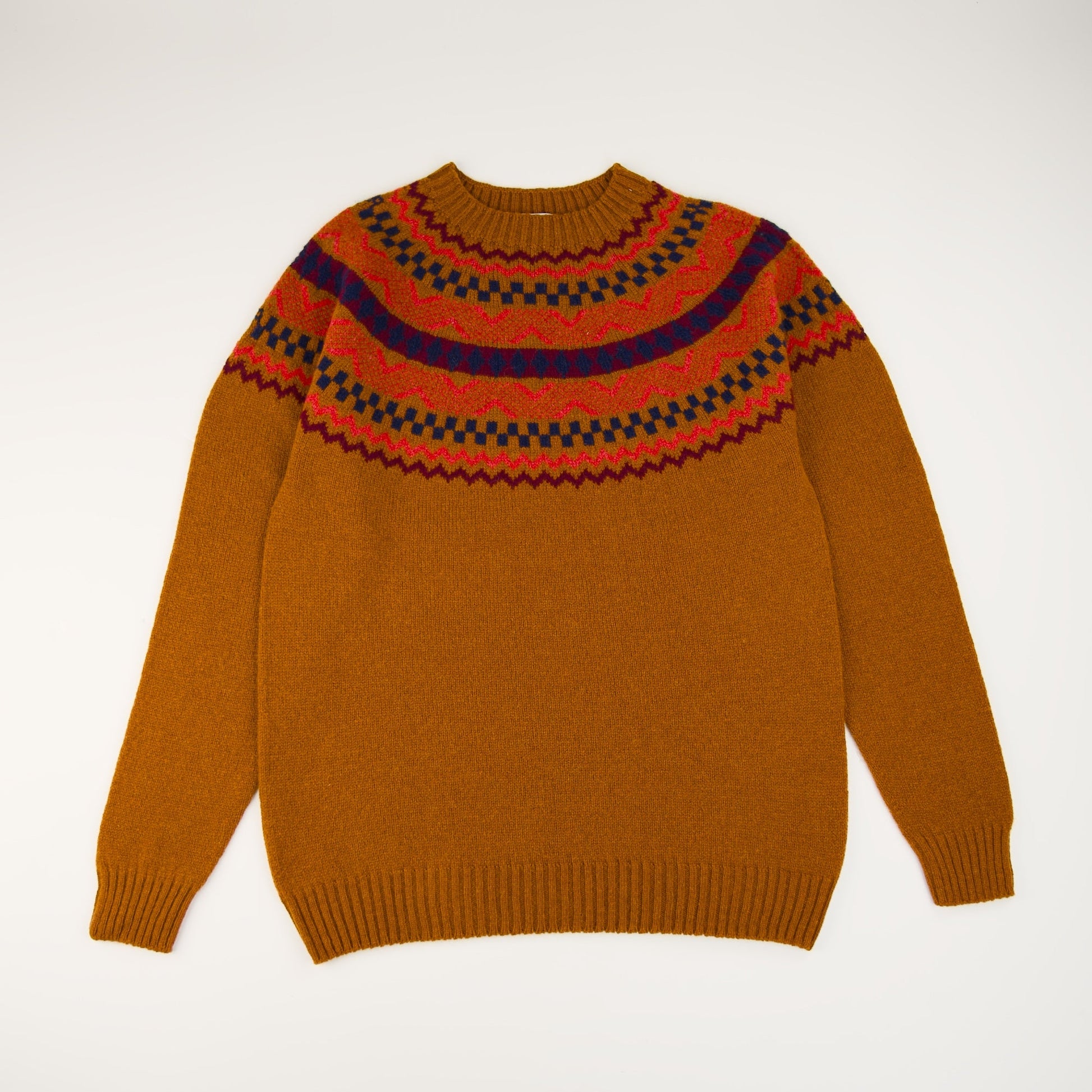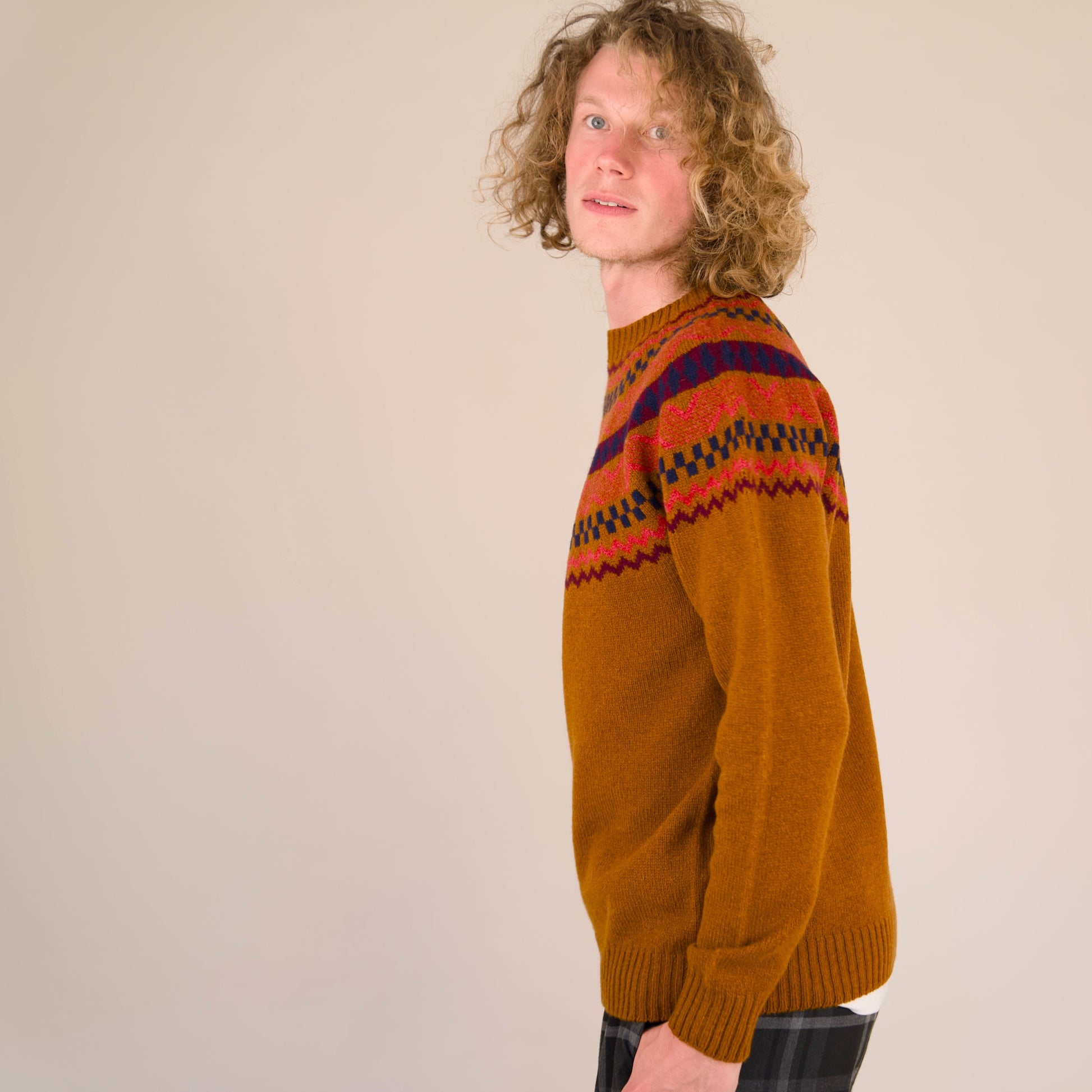 The unmistakable geometric patterns of the Fair Isle jumper have become a symbol of British culture and has long been a favourite of the Royal Family dating back to the 1920s. The Soho is our most technically advanced jumper due to the complex knitting techniques required for the seamless yoke pattern.