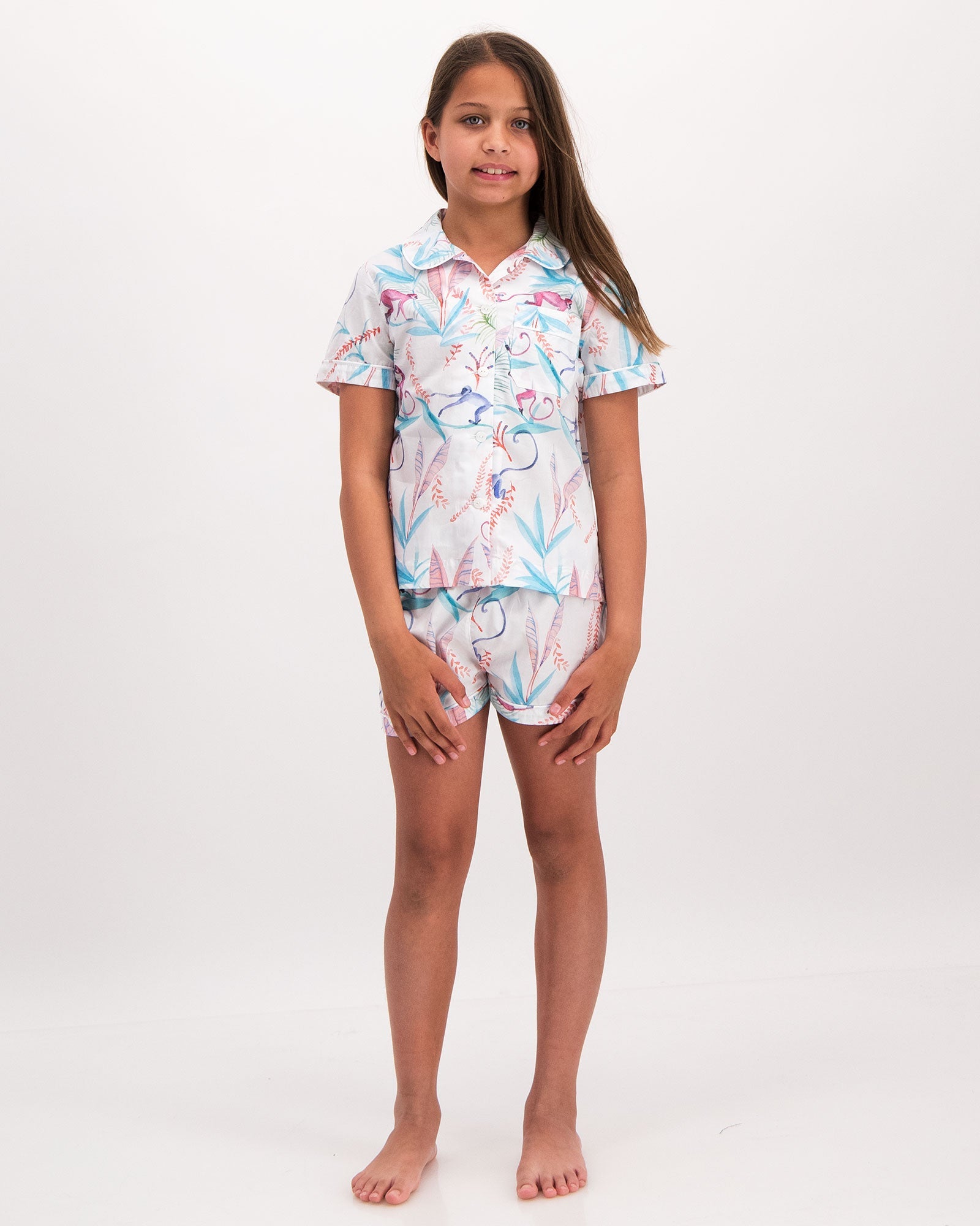 These girls' short pyjamas will have her drifting off in no time. Handmade from soft organic cotton, with delicate piping around the collar and cuffs. Our Monkeys pattern is both cute and stylish.