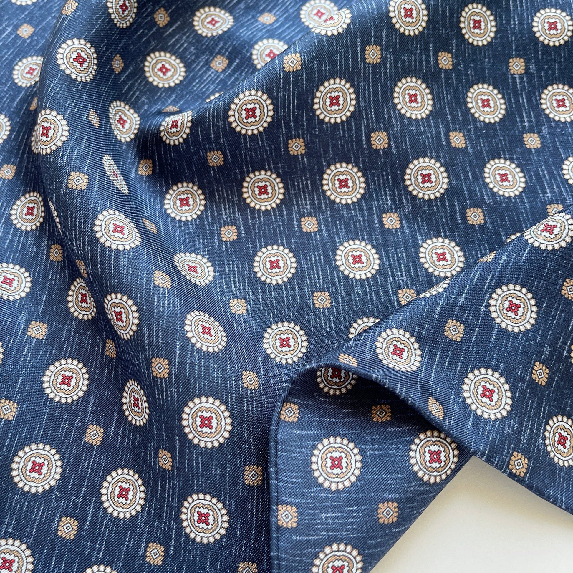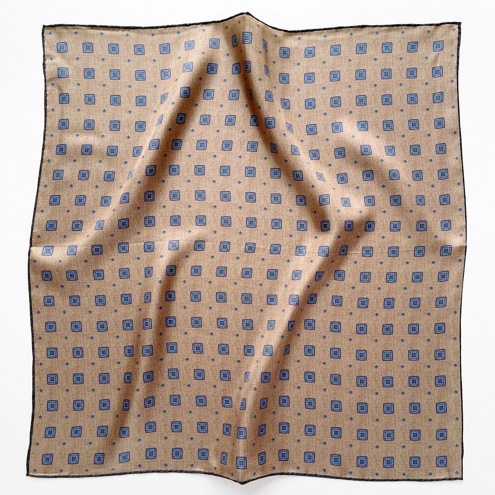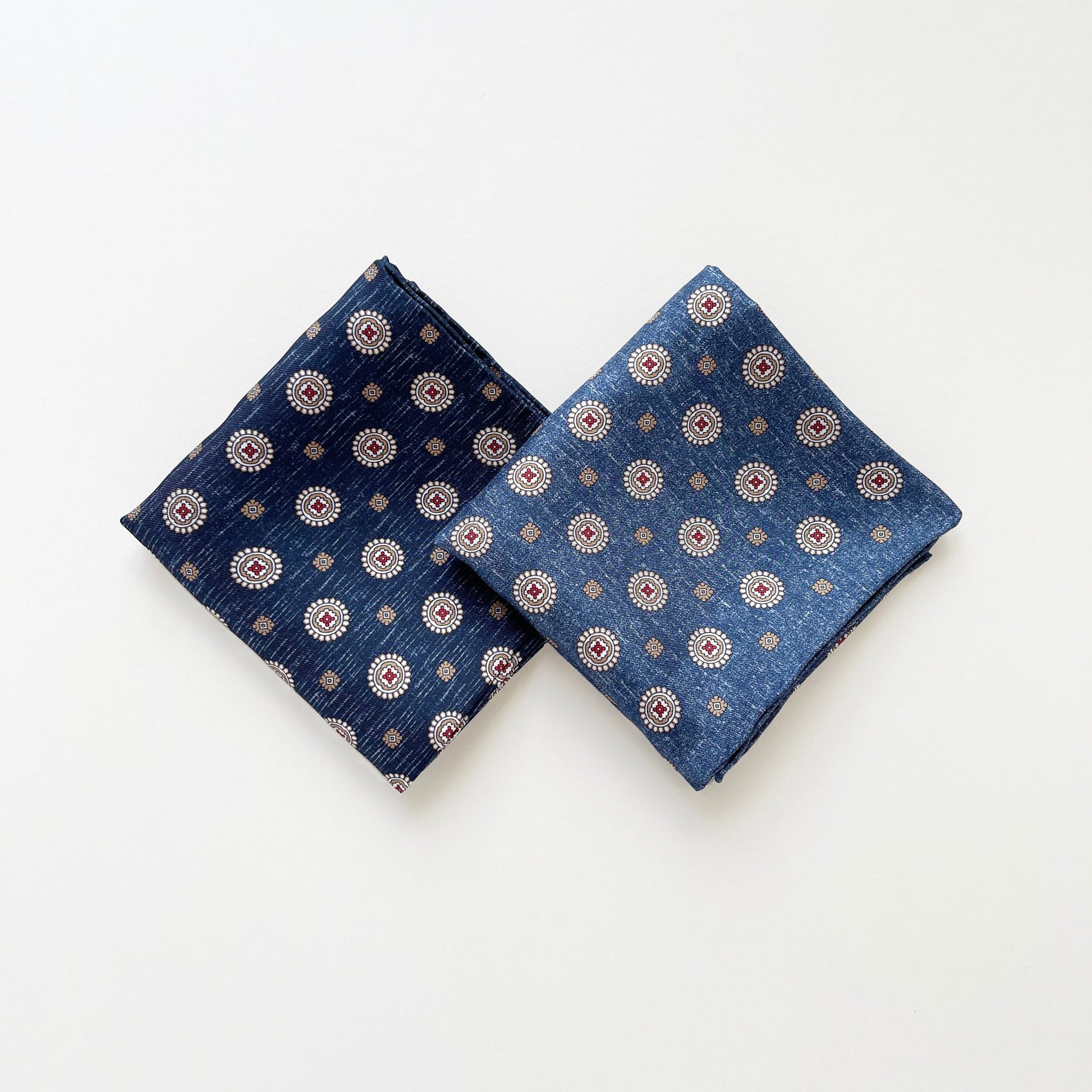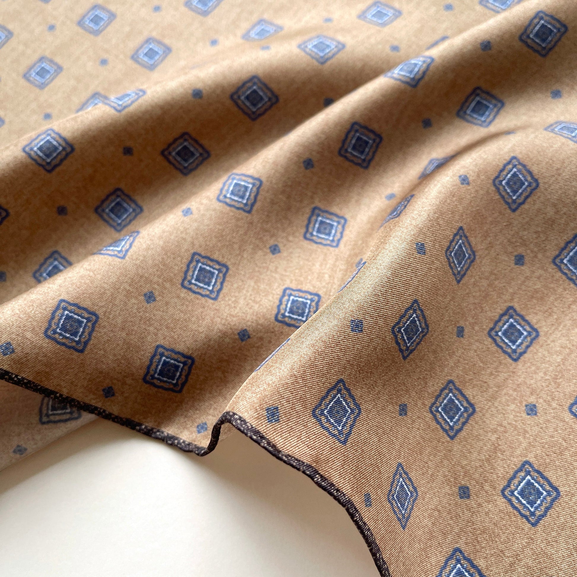 Add a touch of sophistication to your wardrobe with this premium men’s silk neckerchiefs. Crafted from 100% silk twill, these luxurious accessories feature a refined medallion pattern on a rich blue and classic taupe base, perfect for elevating both casual and formal outfits.