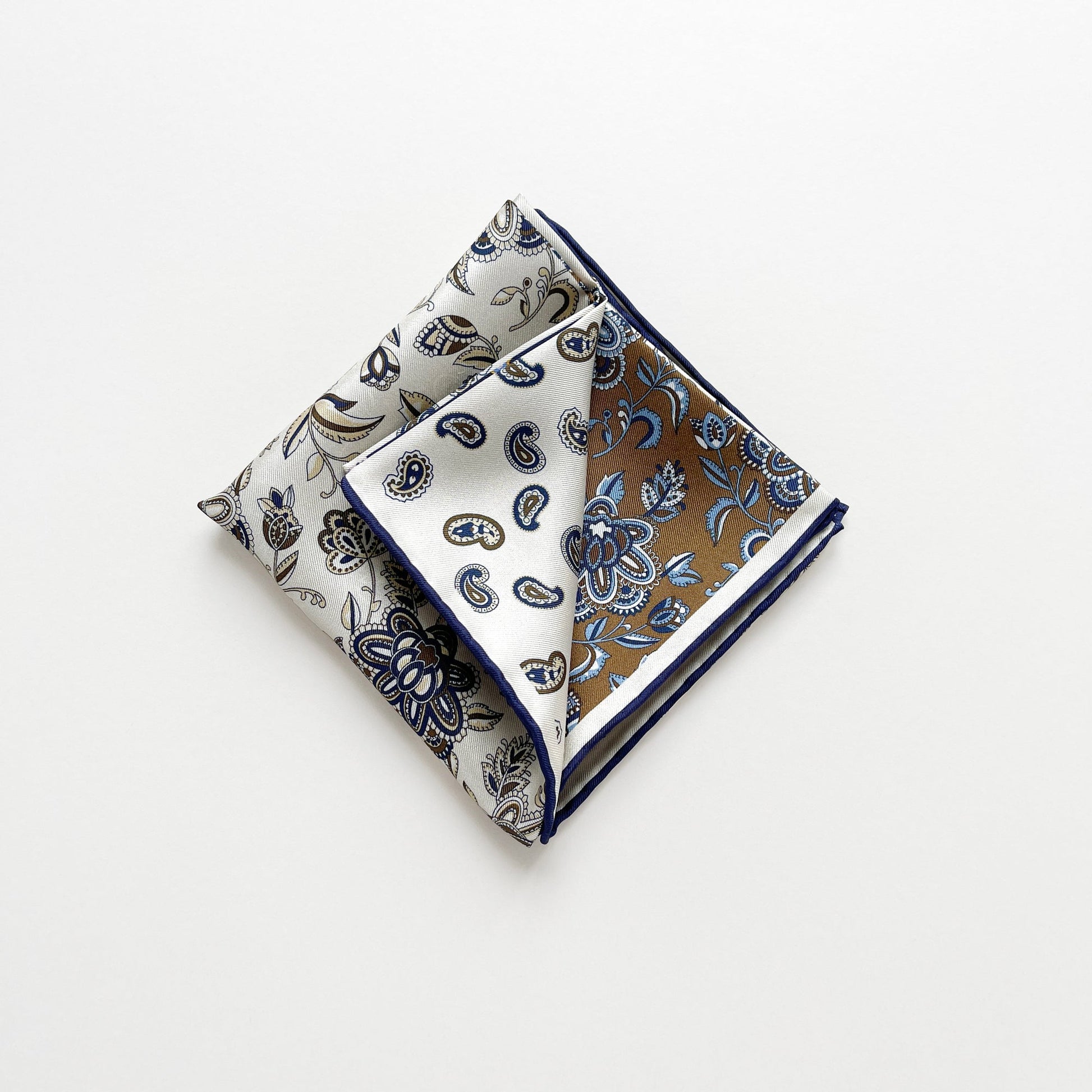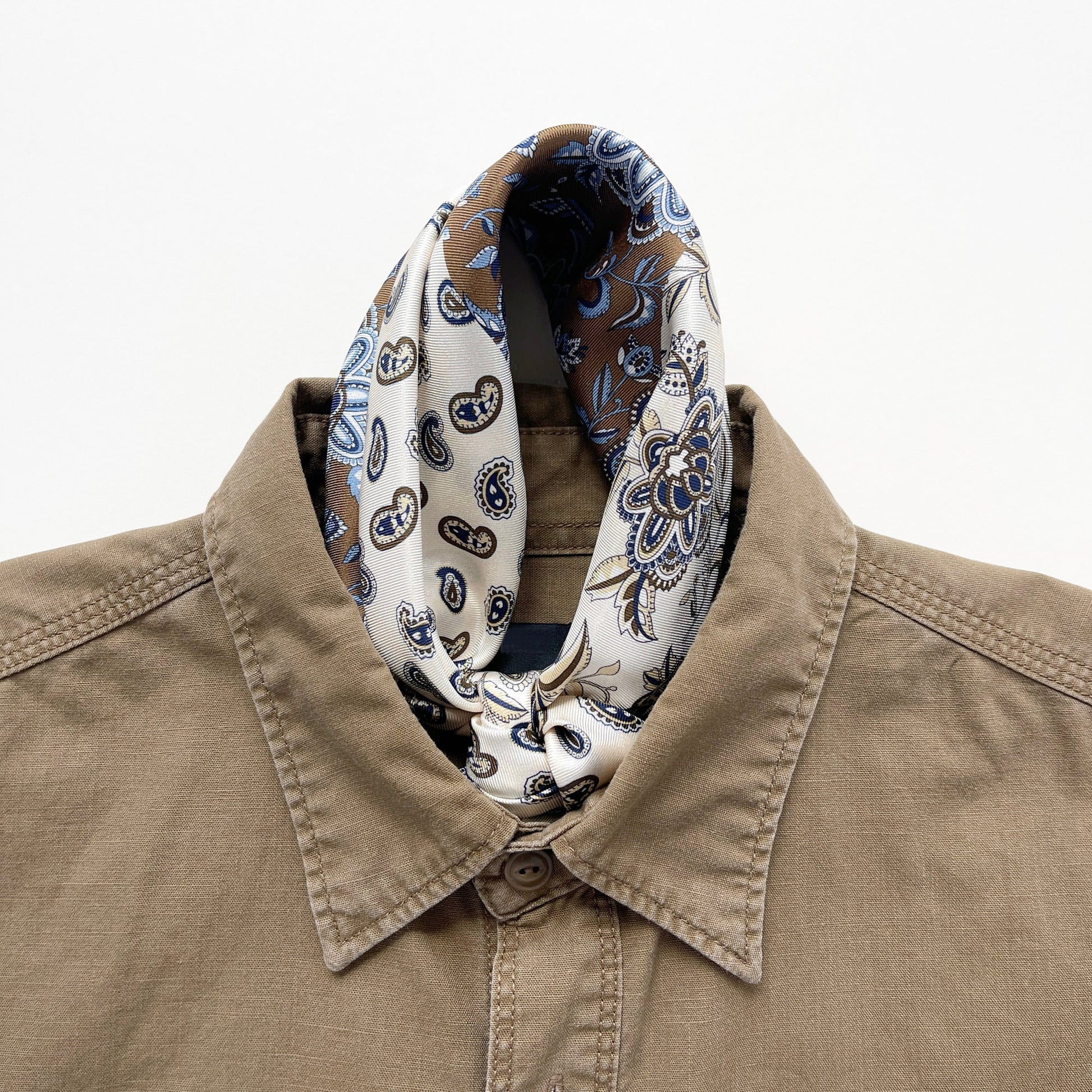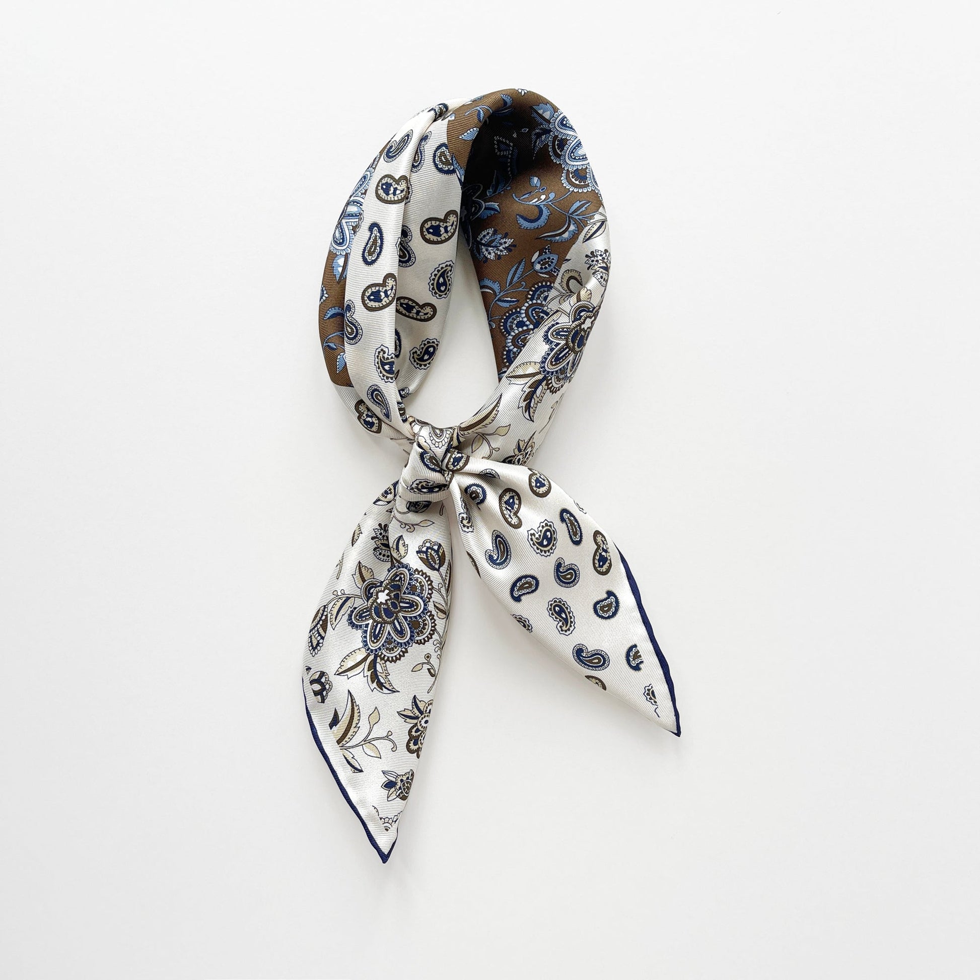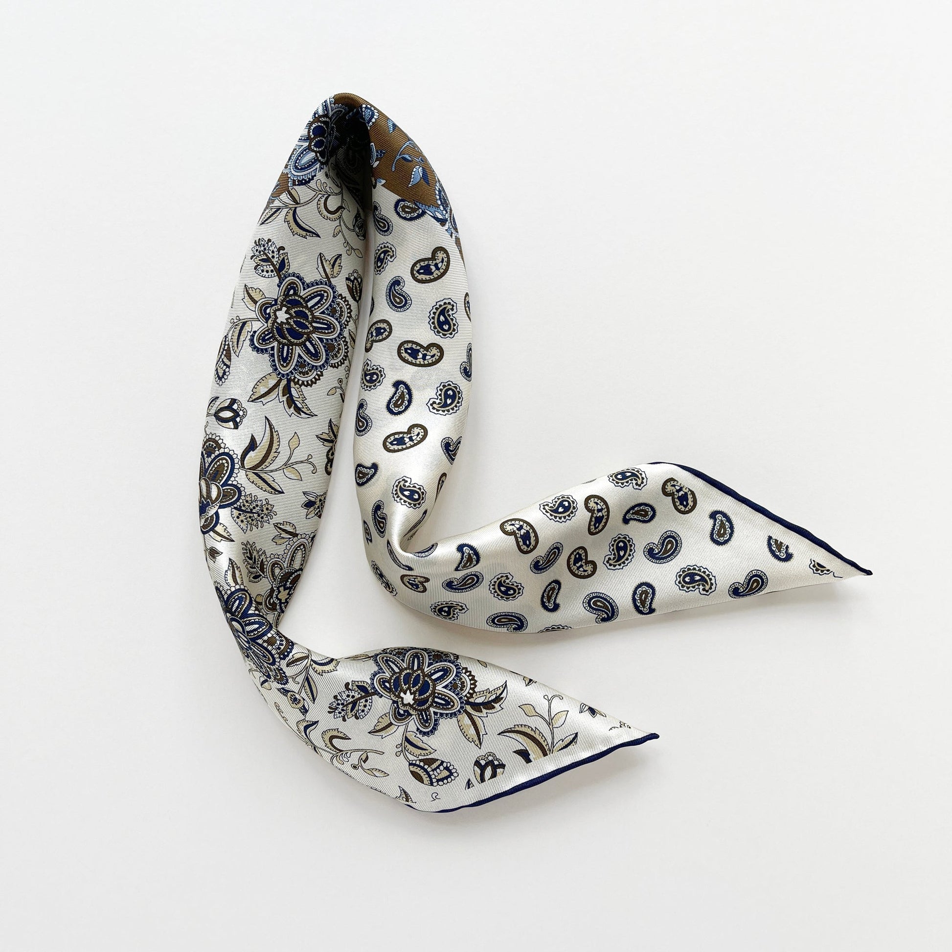 A modern nod to classic style. This 100% mulberry silk square scarf blends timeless paisley and floral motifs in a rich patchwork design of navy, olive brown, and cream. Printed on both sides for depth and versatility, it’s meticulously finished with hand-rolled edges—each one a small testament to artisanal craftsmanship.