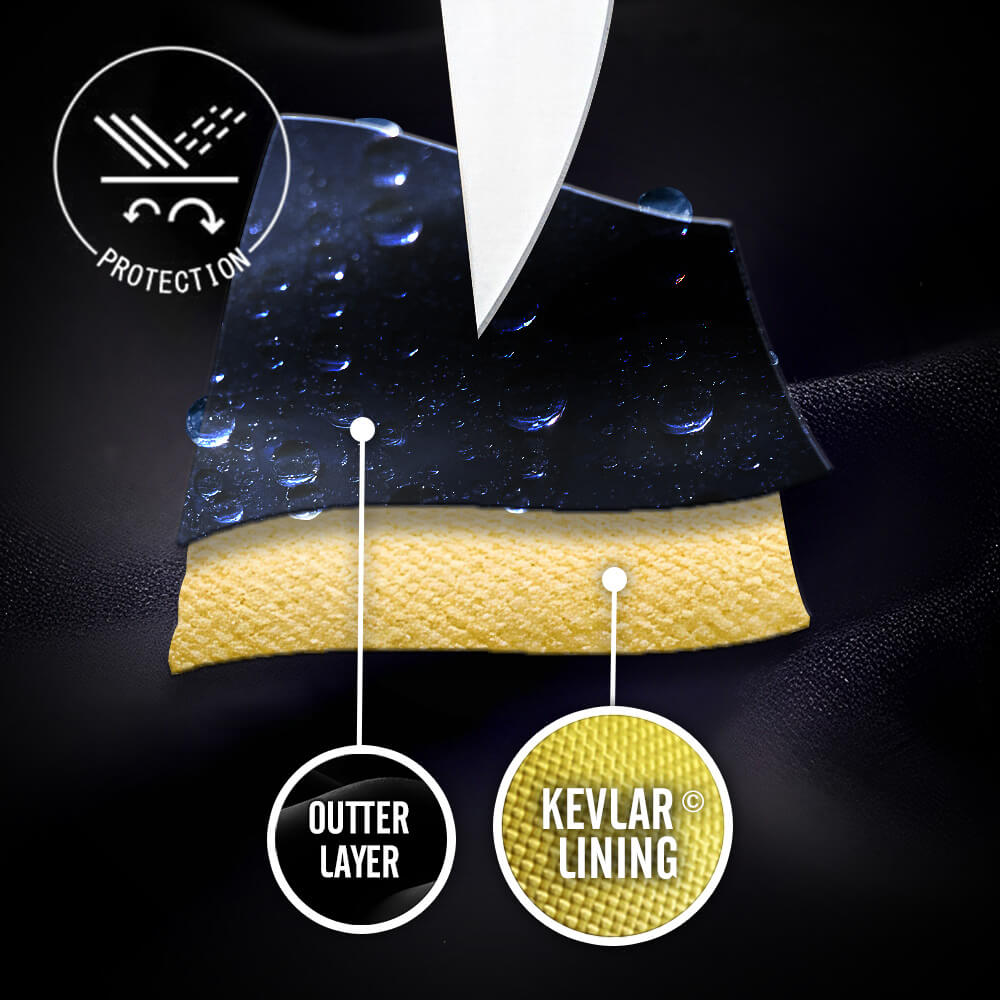Beneath its clean everyday look is a 2-layer advanced protective system, lined with Level 2 cut-resistant Aramid Fibre , the same type of technology used in military and law enforcement gear. This is discreet protection for the modern world but designed to blend in while standing up to blades, slashes and abrasion. (also used for extreme sports)