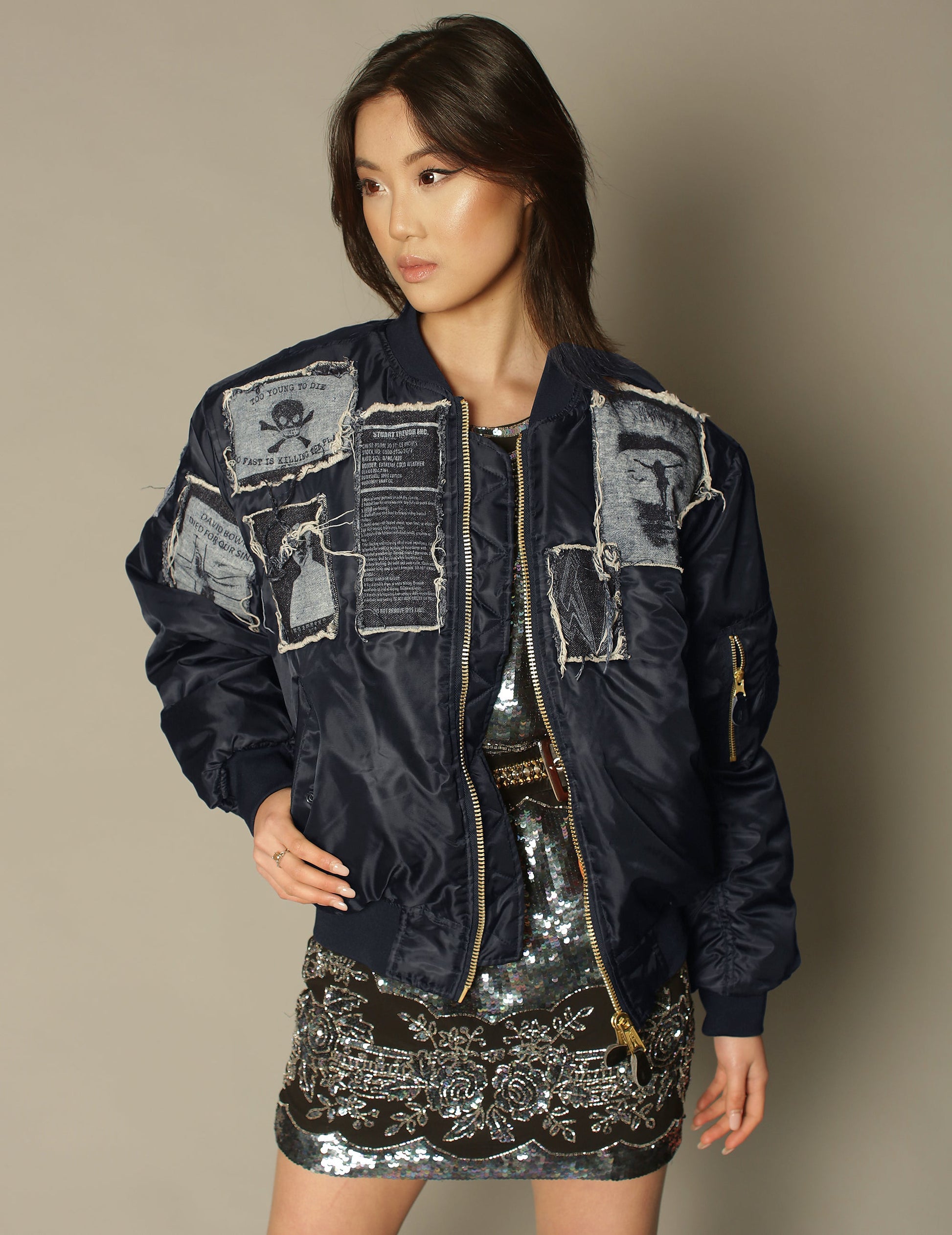 The classic MA-1 bomber jacket in navy, originally designed for the U.S. Air Force and sourced and up-cycled from vintage military dead stock. Features signature ST custom screen printed patches of some of Stuart’s favourite decals and our favourite Rock n Roll icon mugshot on the back. This style is a reversible design with a bright orange lining with interior pockets, originally intended for emergency visibility.