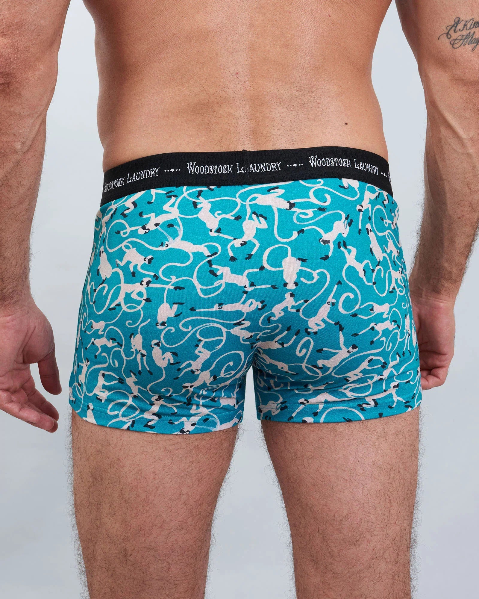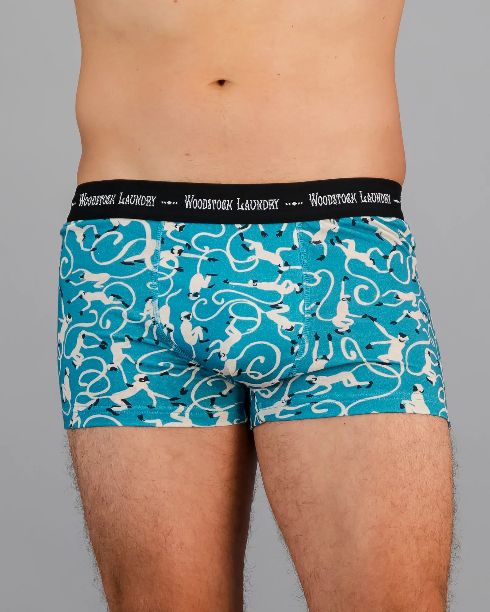 Handmade from a soft and stretchy cotton spandex knit, these boxer briefs will keep you cool and comfortable all day long. This pattern is a firm favourite with fun and funky cream monkeys on teal 100% organic cotton fabric.