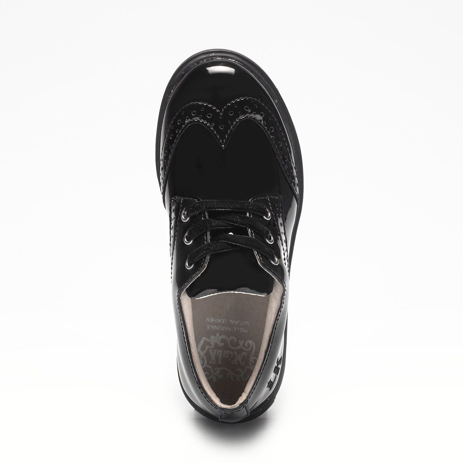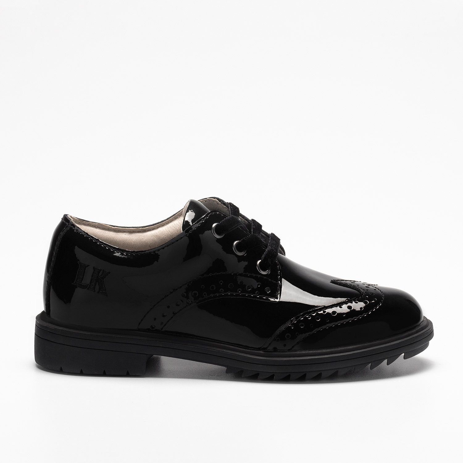 On trend school shoe by Miss LK by Lelli Kelly, Kara black patent brogue school shoes are a great choice for older girls. Soft leather patent brogue with a chunky non slip sole, the front features leather detailing in a classic brogue style.