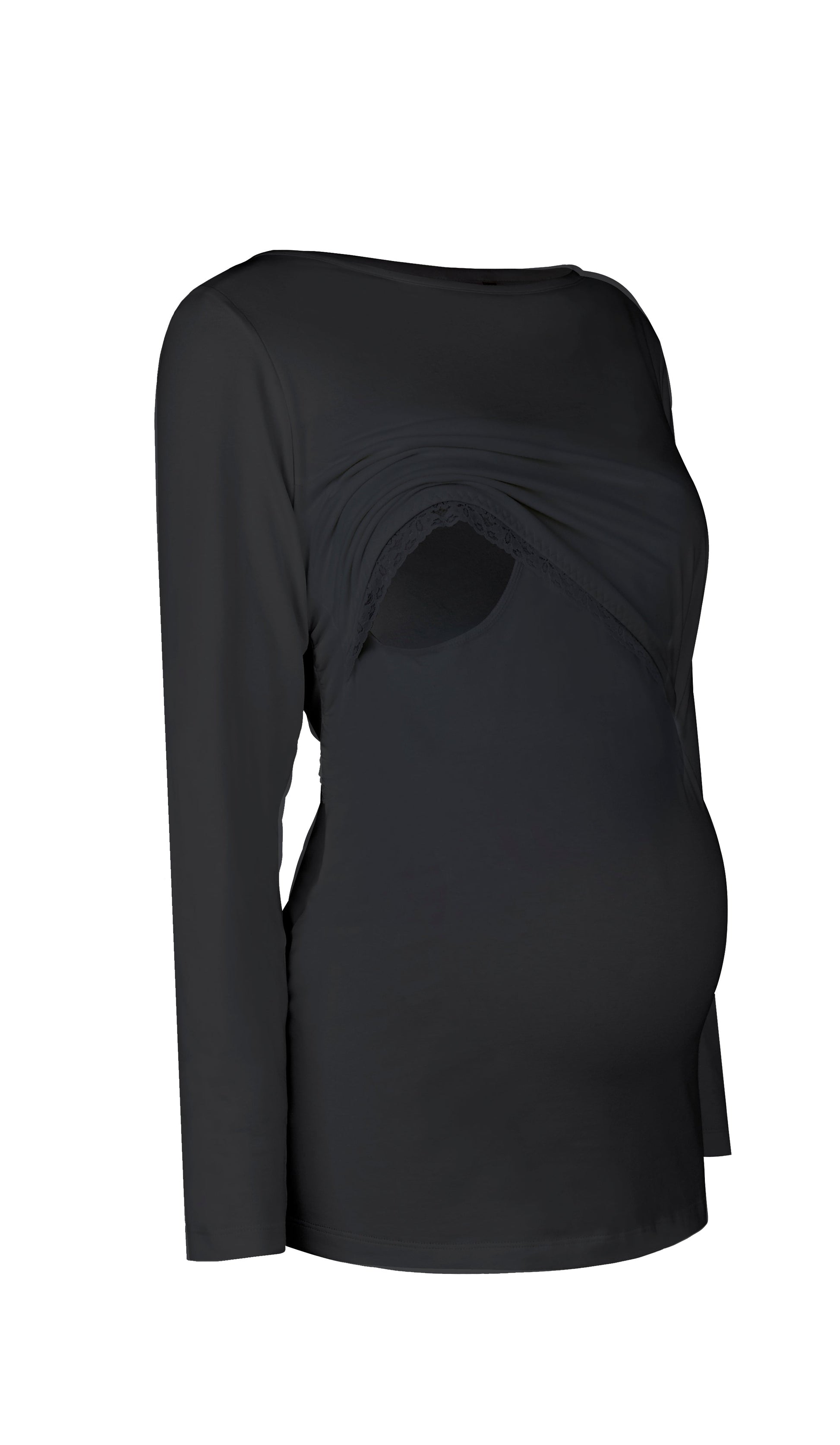 This black with lace long sleeve t-shirt ensures all-day comfort with a gentle hand feel that's both sustainable and eco-friendly. Elevate your nursing wardrobe with this essential breastfeeding piece, blending style, comfort, and functionality at every stage of motherhood.