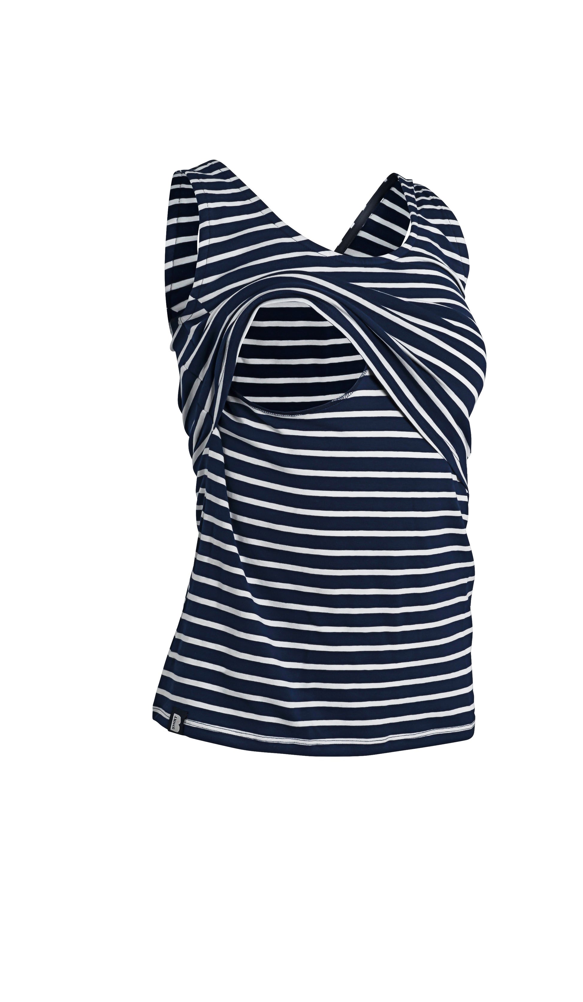 This Navy and white stripes vest seamlessly blends fashion and functionality. It is perfect for nursing anywhere, whether at home or on the go, providing convenient access for breastfeeding while keeping you stylish. Elevate your nursing wardrobe with this stylish, award-winning breastfeeding essential, offering ease, comfort, and sophistication at every stage of motherhood.