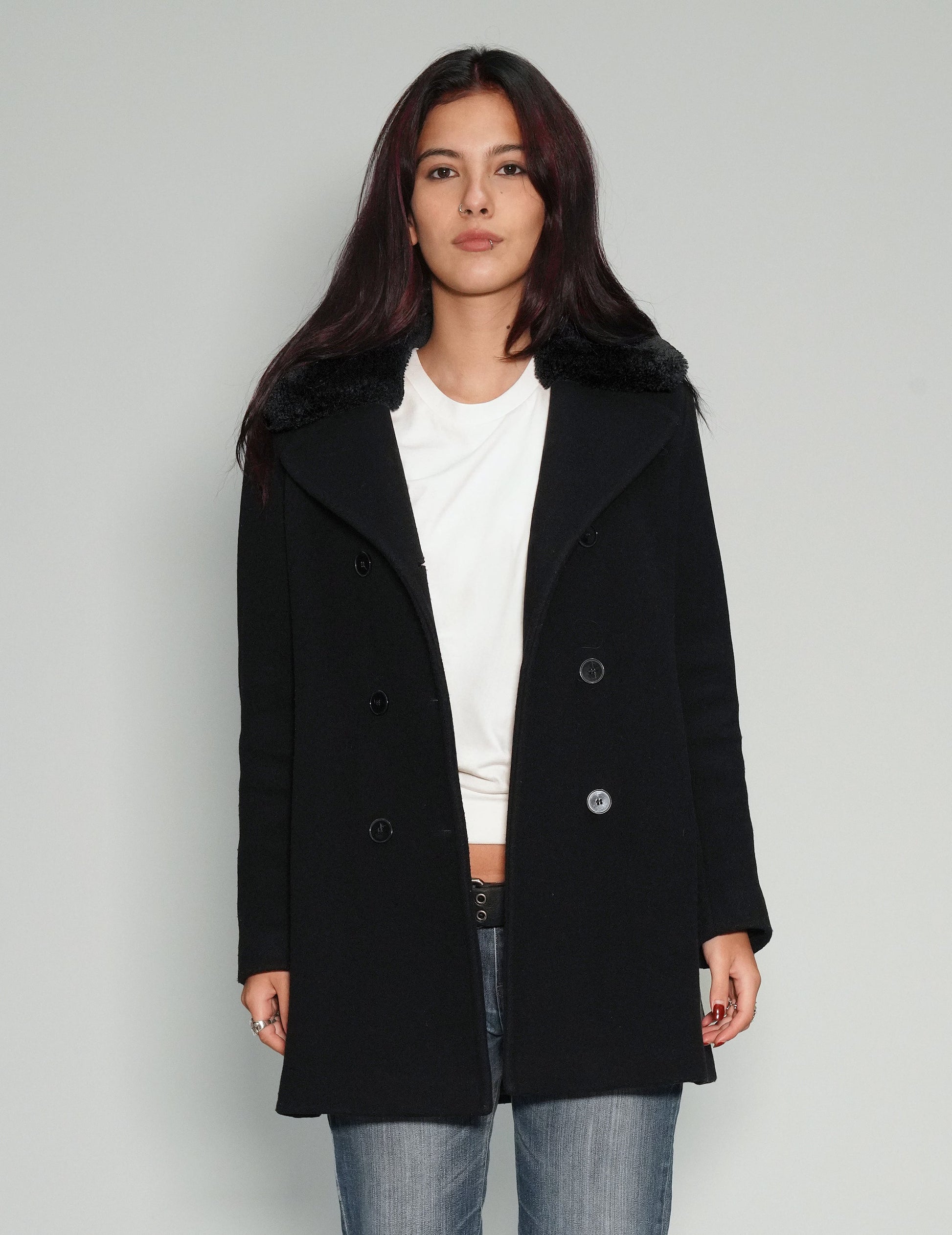 Women's vintage black button up blazer jacket with fur collar, customised with our signature ST gold sequin, art-deco style sheer back panel. Model is 5'8 wearing a size M.