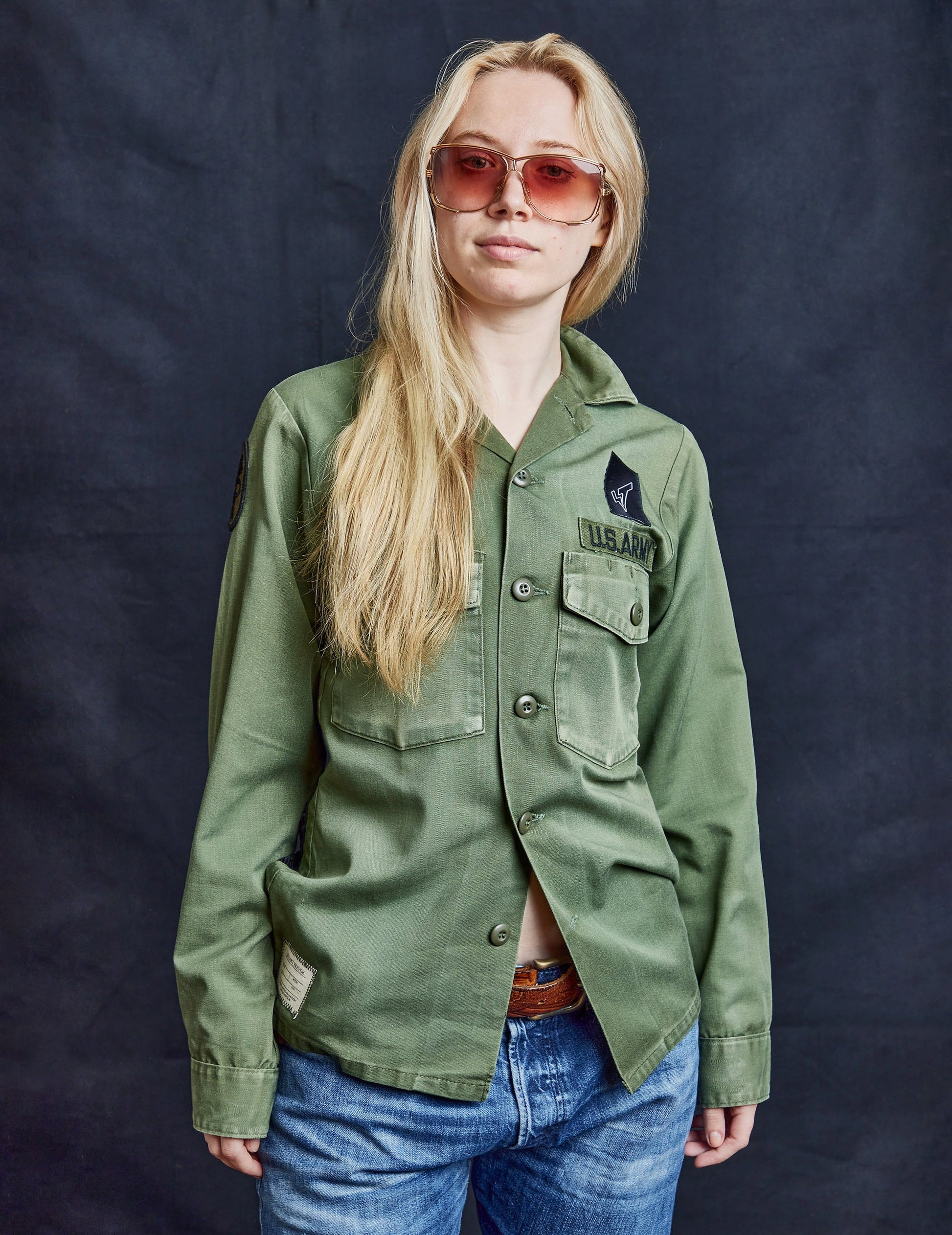 Vintage US Army khaki long sleeve shirt customised with black lace, art-deco style sheer back panel. Features two button-fastened breast pockets, and ST logo branded patch. Model is 5'8" wearing size M.