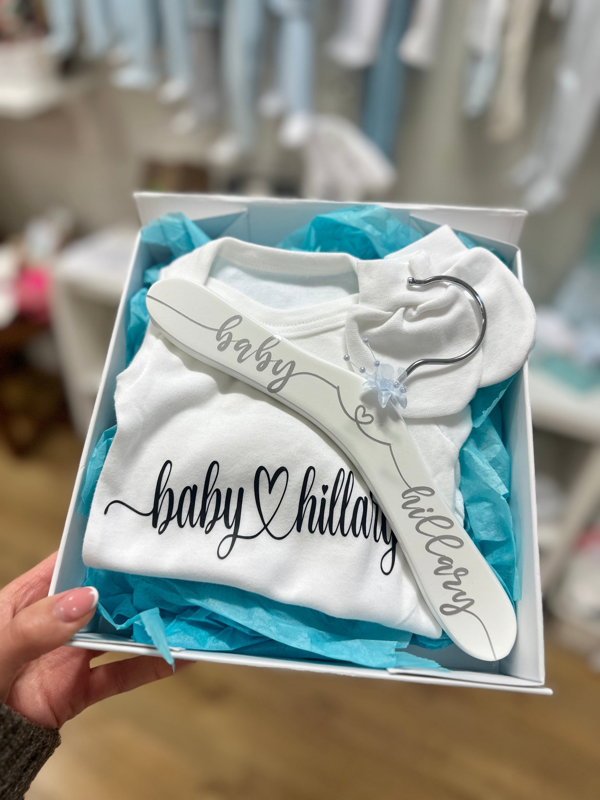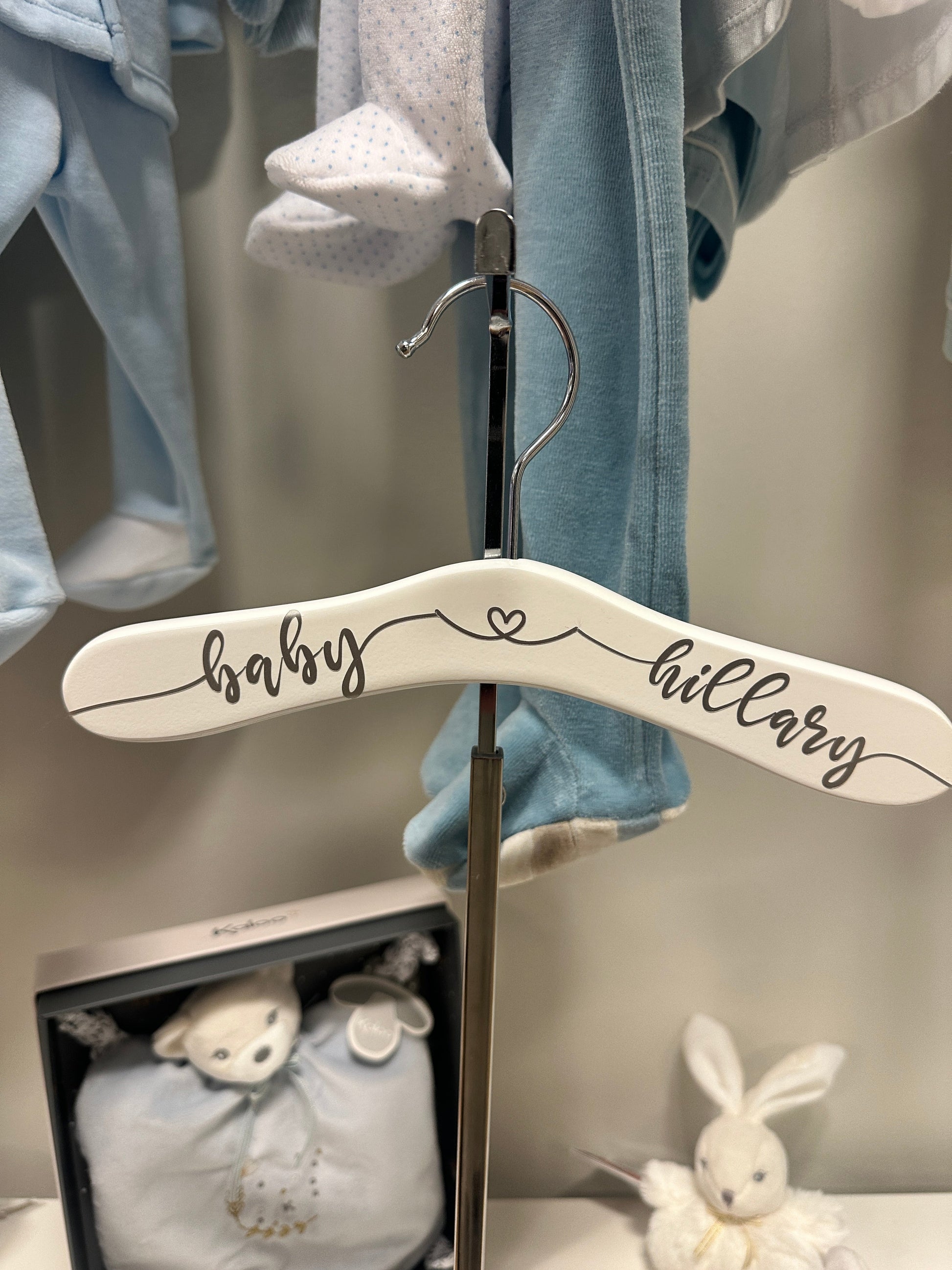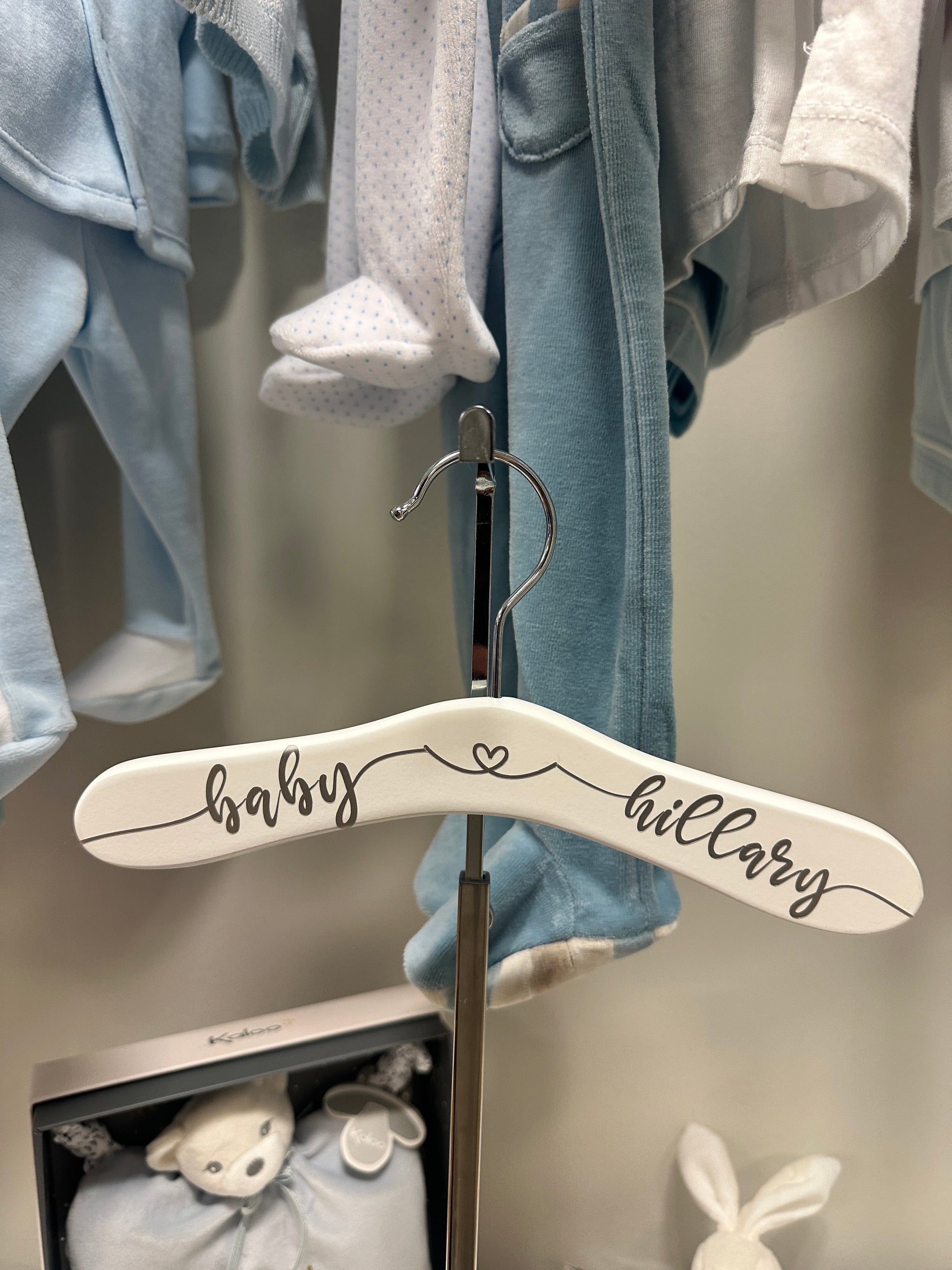 Personalised Wooden Hanger with Baby Name - personalised with your own text, ready for you to fill with your gifts! Option to change font or add dates etc, if you wish to see more ideas send an email.