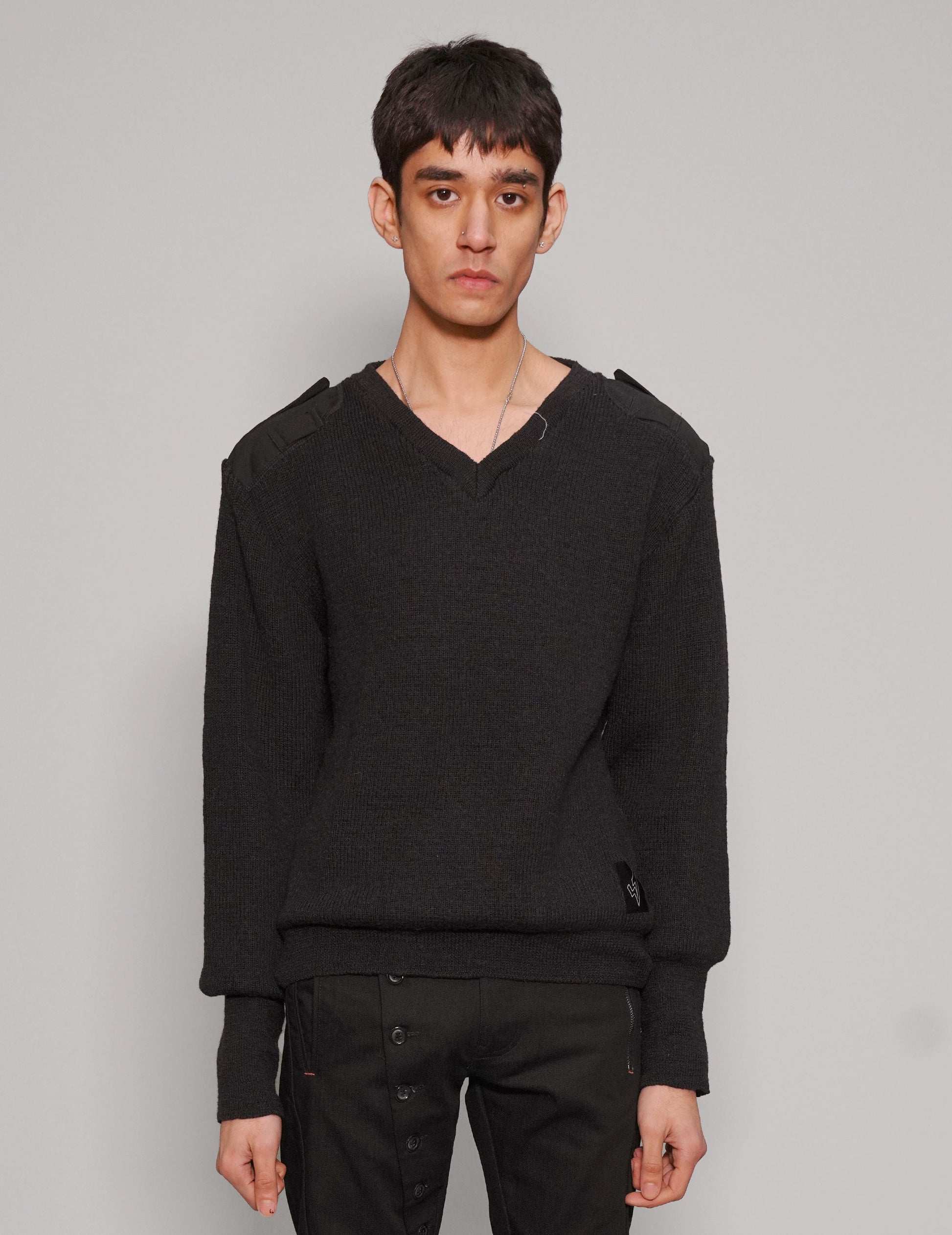 Vintage Ex-Met Police V-neck Sweater, 100% Wool. Features Velcro epaulettes, and ST branded logo patch.