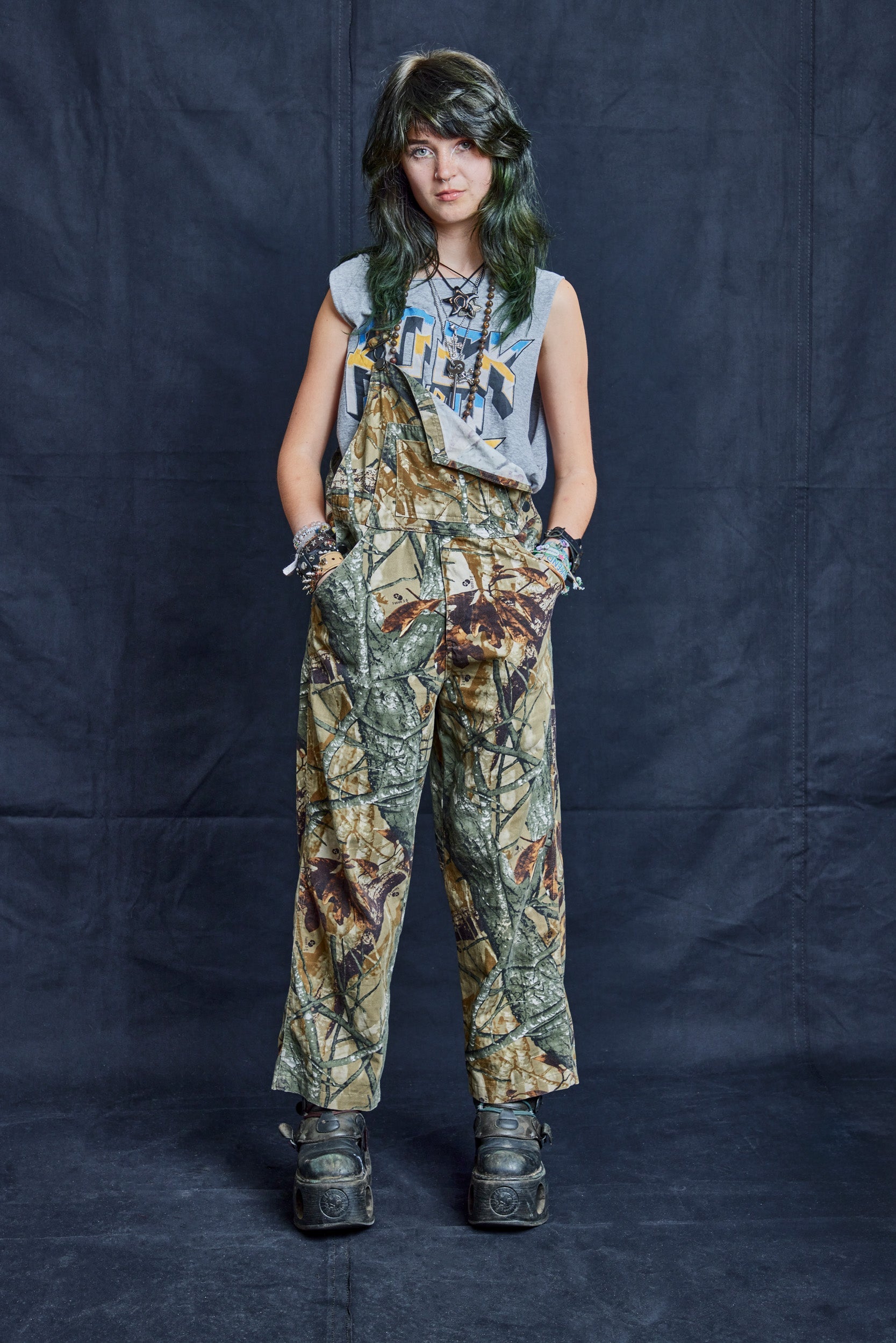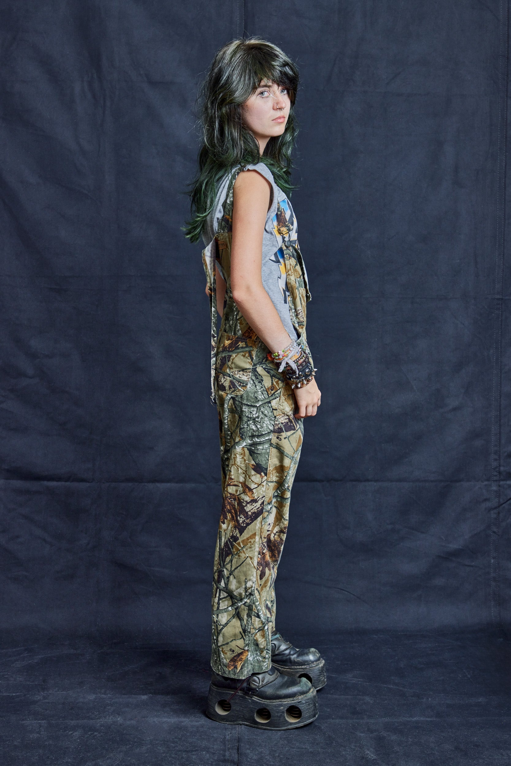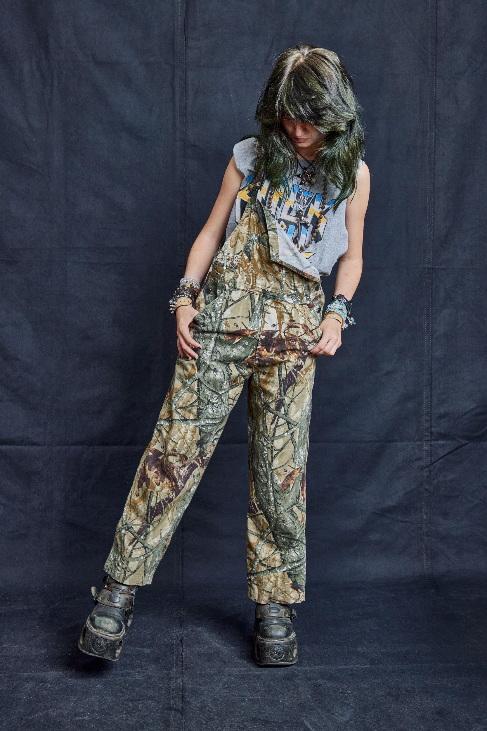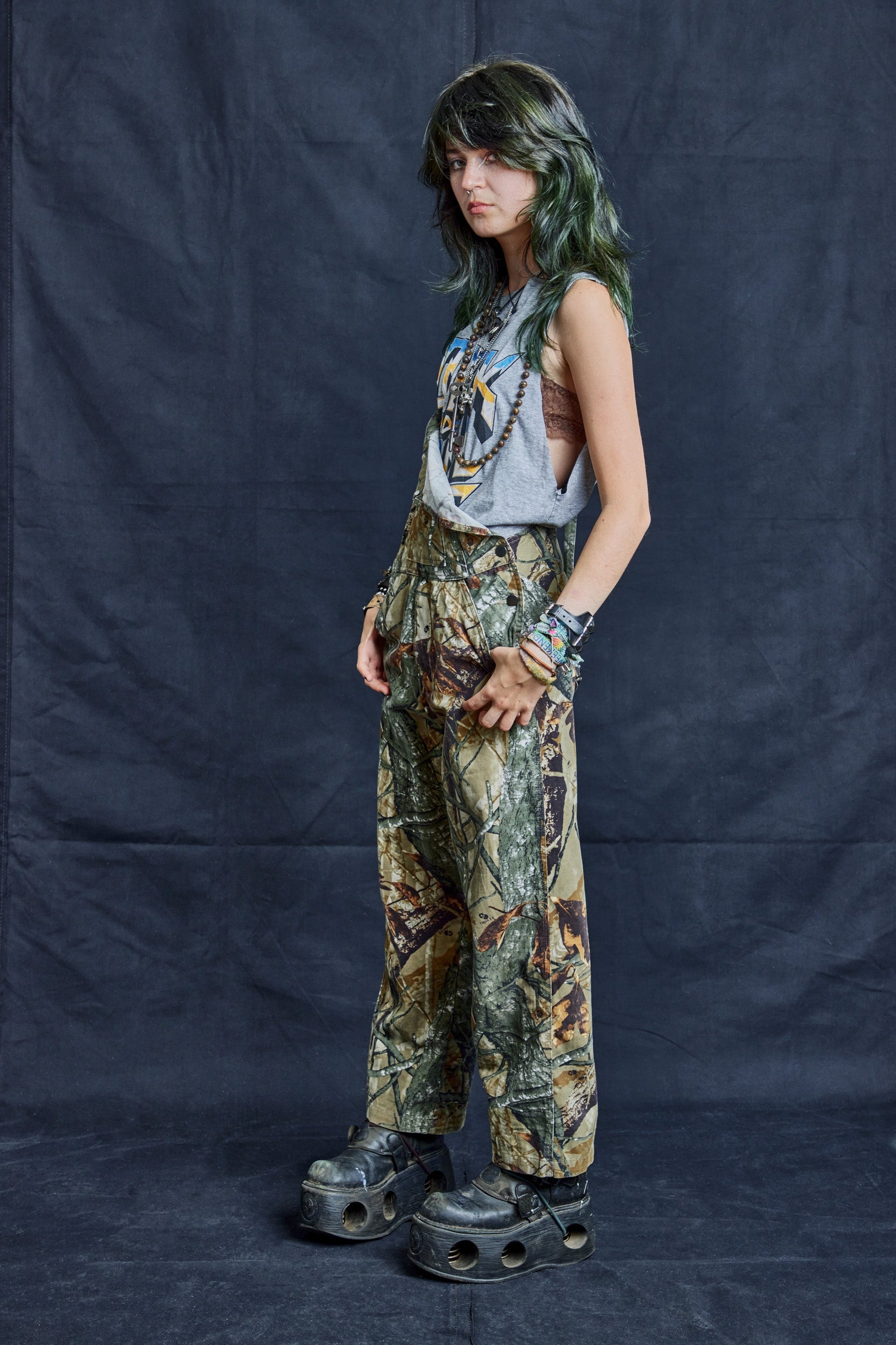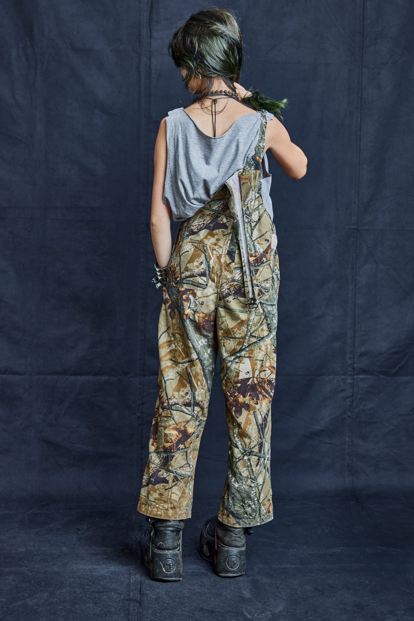 Repurposed Outfitters Ridge Realtree Camo Dungarees, 100% Cotton. Features hip slit pockets, and cargo pockets on the front.
