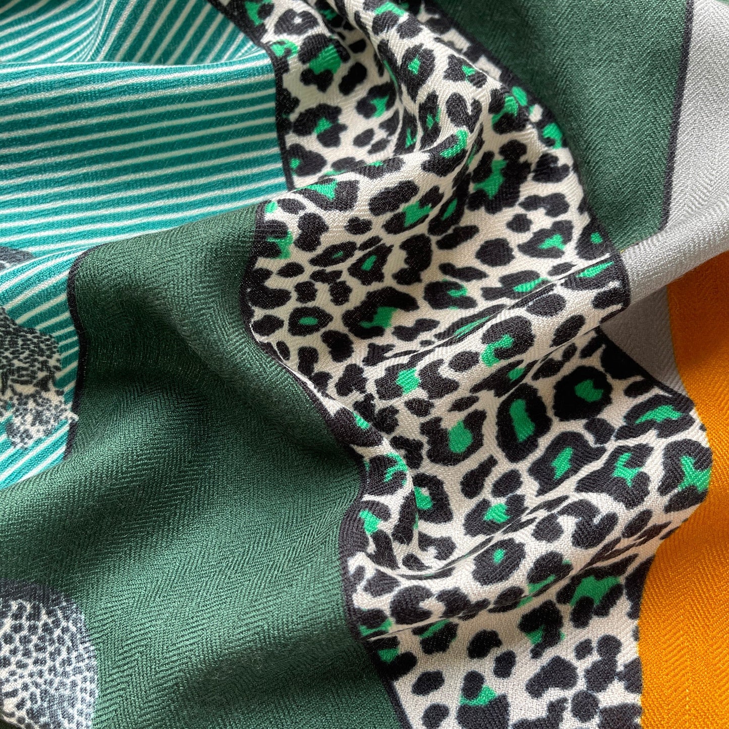 Thoughtfully designed in two unique colour palettes and enhanced by signature leopard prints. The warm palette features rich hues of red, beige, brown, and mustard, perfect for adding a cosy, vibrant touch; While the cool palette, blending sophisticated shades of green, grey, and turquoise, offers a refreshing complement to any look. Ideal for cooler seasons, this scarf adds a refined elegance, making it a chic addition for yourself or a thoughtful, stylish gift for loved ones.