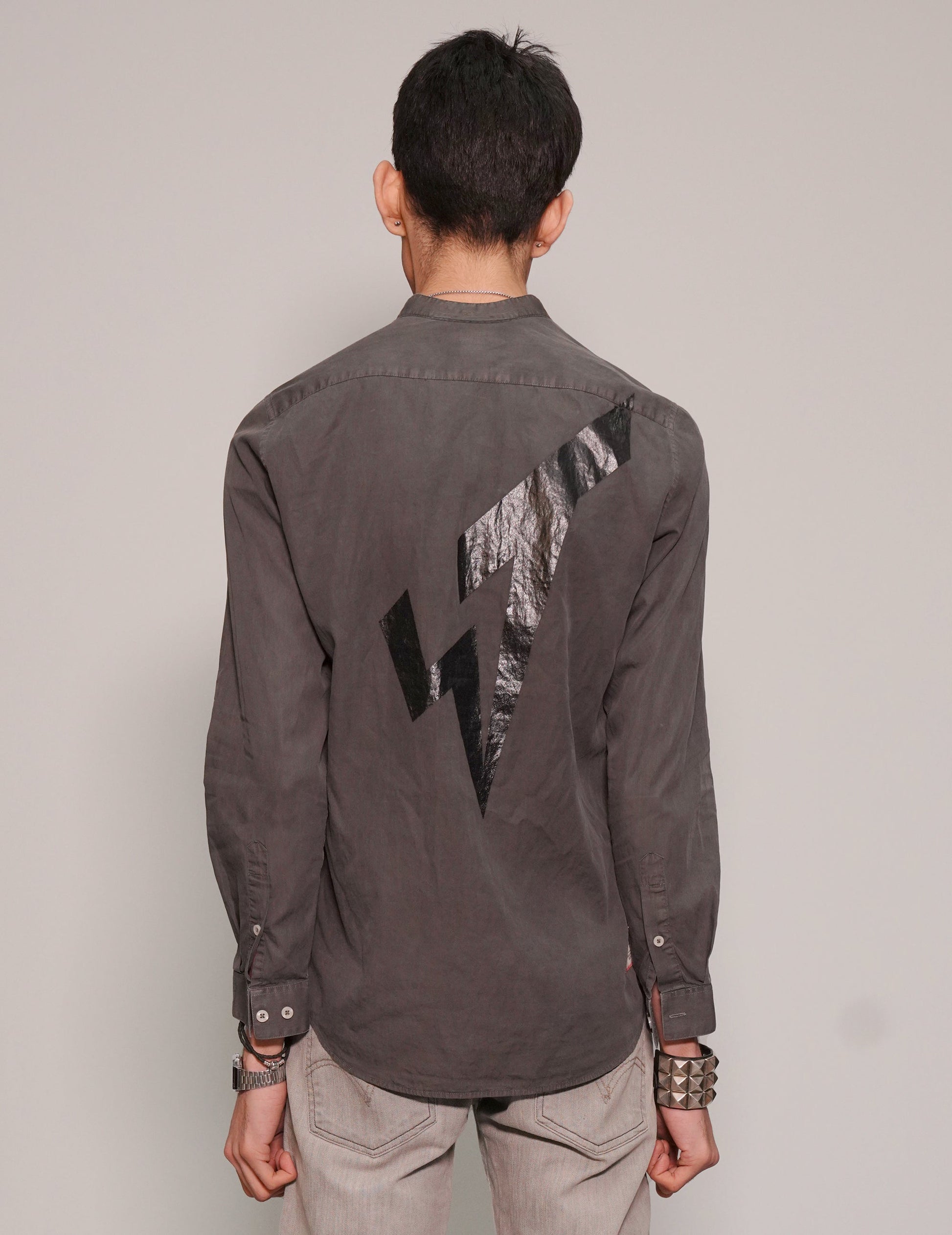 Mens dark grey shirt featuring full button-down lapel and half cut collar. Customised with hand printed, distorted image of our favourite Rock n Roll icon mugshot. Completed with the ST logo in black across the back.