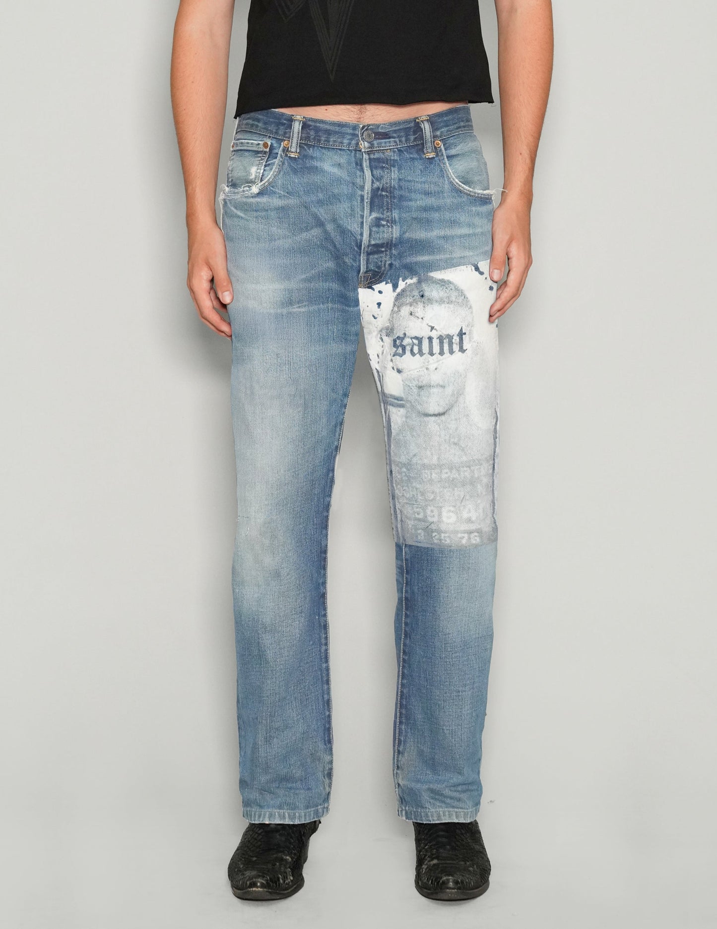 Unisex, 'Saint' Vintage Levi’s 501 jeans. Each pair is super rare and printed in our East London tailoring shop, featuring a custom screen print of our favourite Rock n Roll icon mugshot. All come with the finest detailing with ST logo and labelling, signed and dated with your name by Stuart, himself. Grab these special jeans, while stock lasts!
