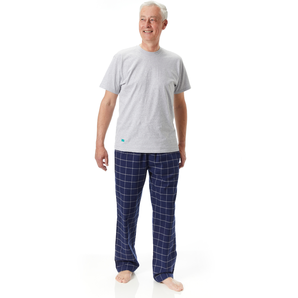 Supremely soft organic brushed cotton trousers that are both ethical and versatile. This blue with a subtle grey line is an understated must-have, designed to be worn both in and out of the home.