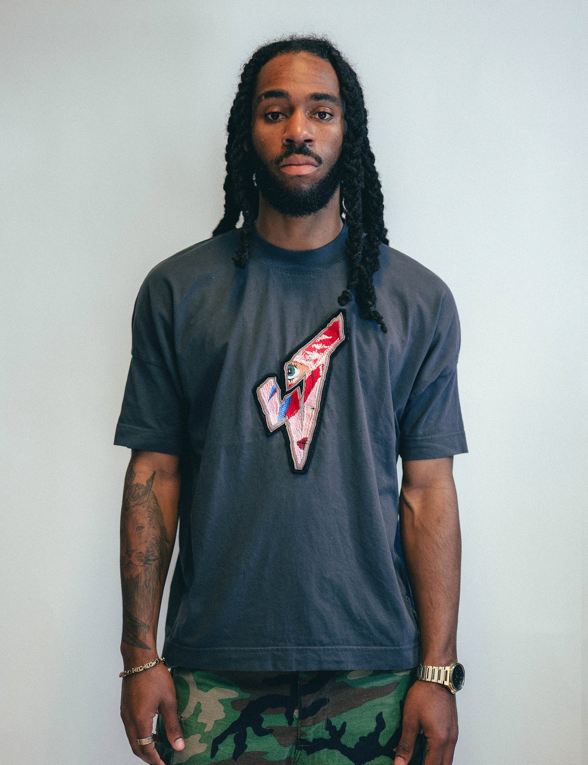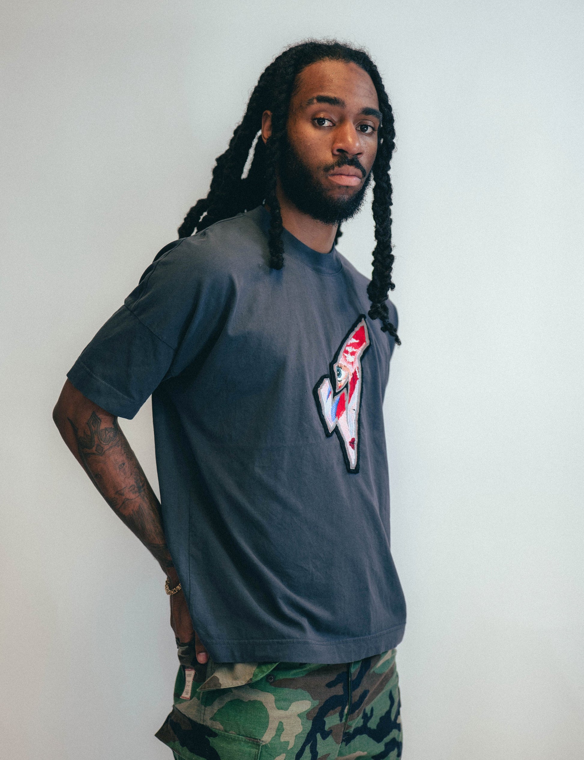 Mens Bluish Grey t-shirt crafted from soft, GOTS certified, 100% organic recycled cotton with relaxed fit with large embroidered ST patch, featuring the eye of Aladdin Sane from our favourite Rock n Roll icon.
