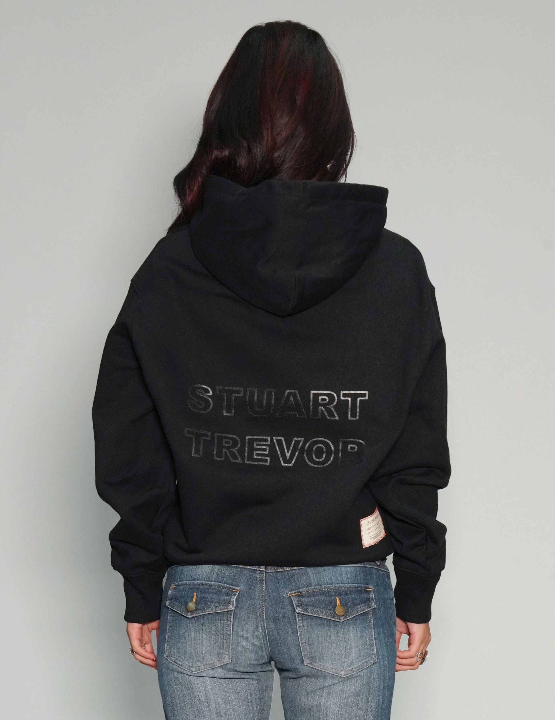 Heavyweight 500gm, Premium Quality, 100% GOTS-certified Organic Cotton Hoodie; Printed with the ST Solid Logo on the front in Black, and STUART TREVOR Monogram stencil on the back. Featuring Set-in sleeve, double layered drawstring hood in self fabric, and Kangaroo pocket on the front.
