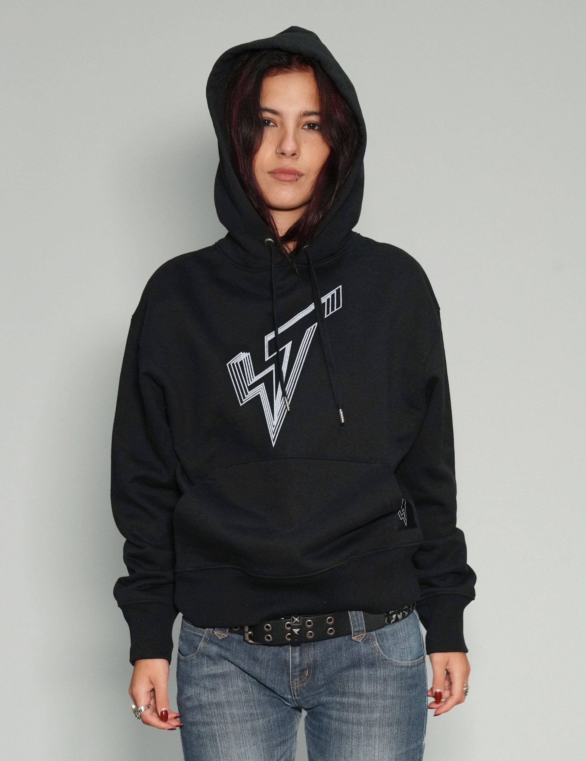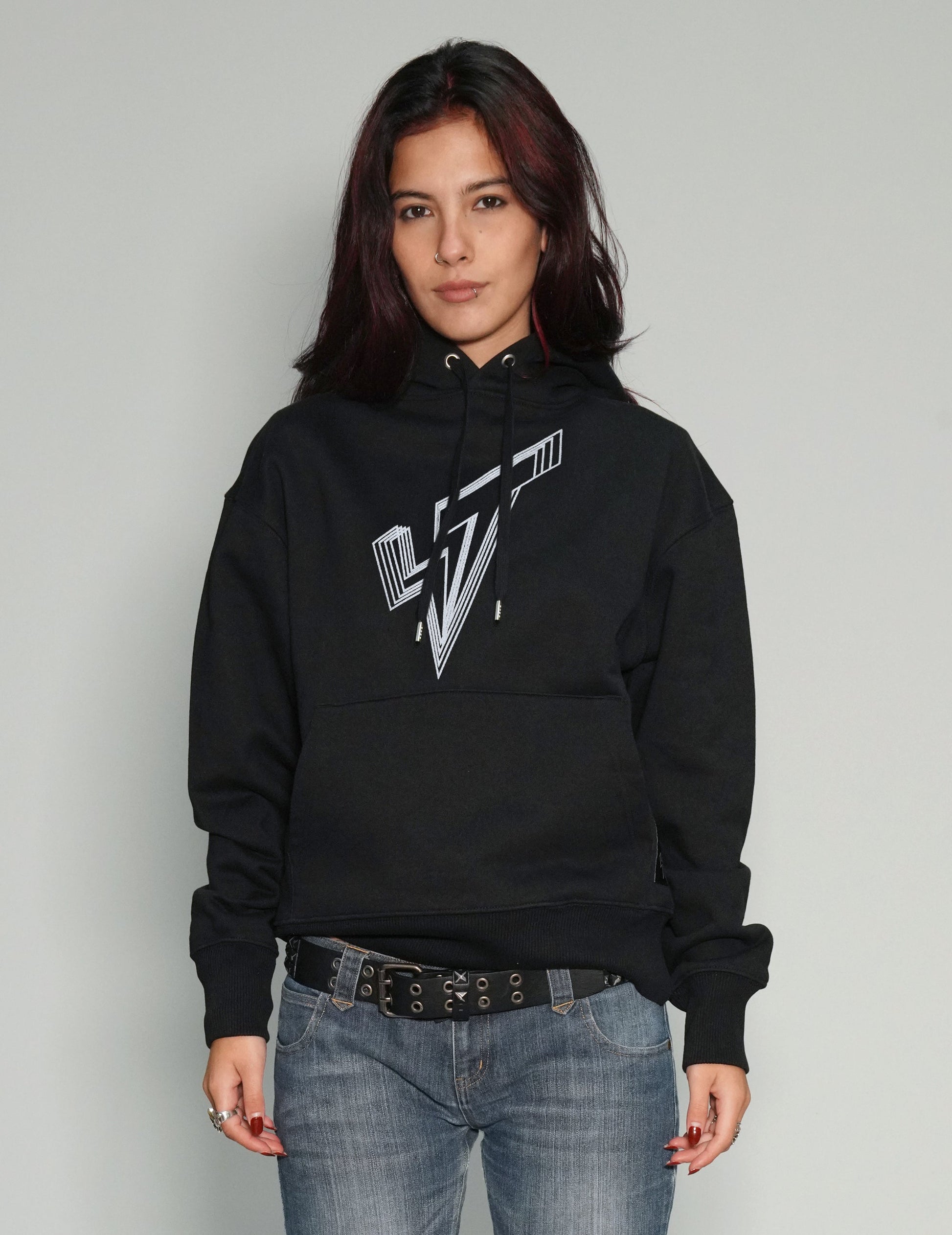 Women's black hoodie, printed with the ST lined logo on the front in metallics silver. Featuring set-in sleeve, double layered hood in self fabric, and kangaroo pocket on the front.