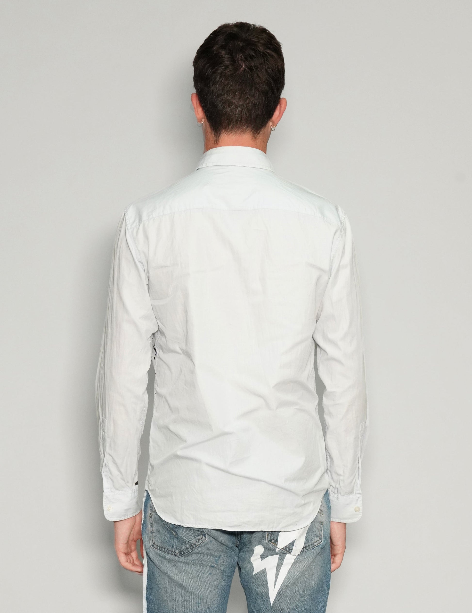 Repurposed Club Monaco shirt, 100% cotton. Hand-painted in our East London tailoring shop, with large Ink Splotch and 'ST' on the bottom left. Features button collar and button fastening front.