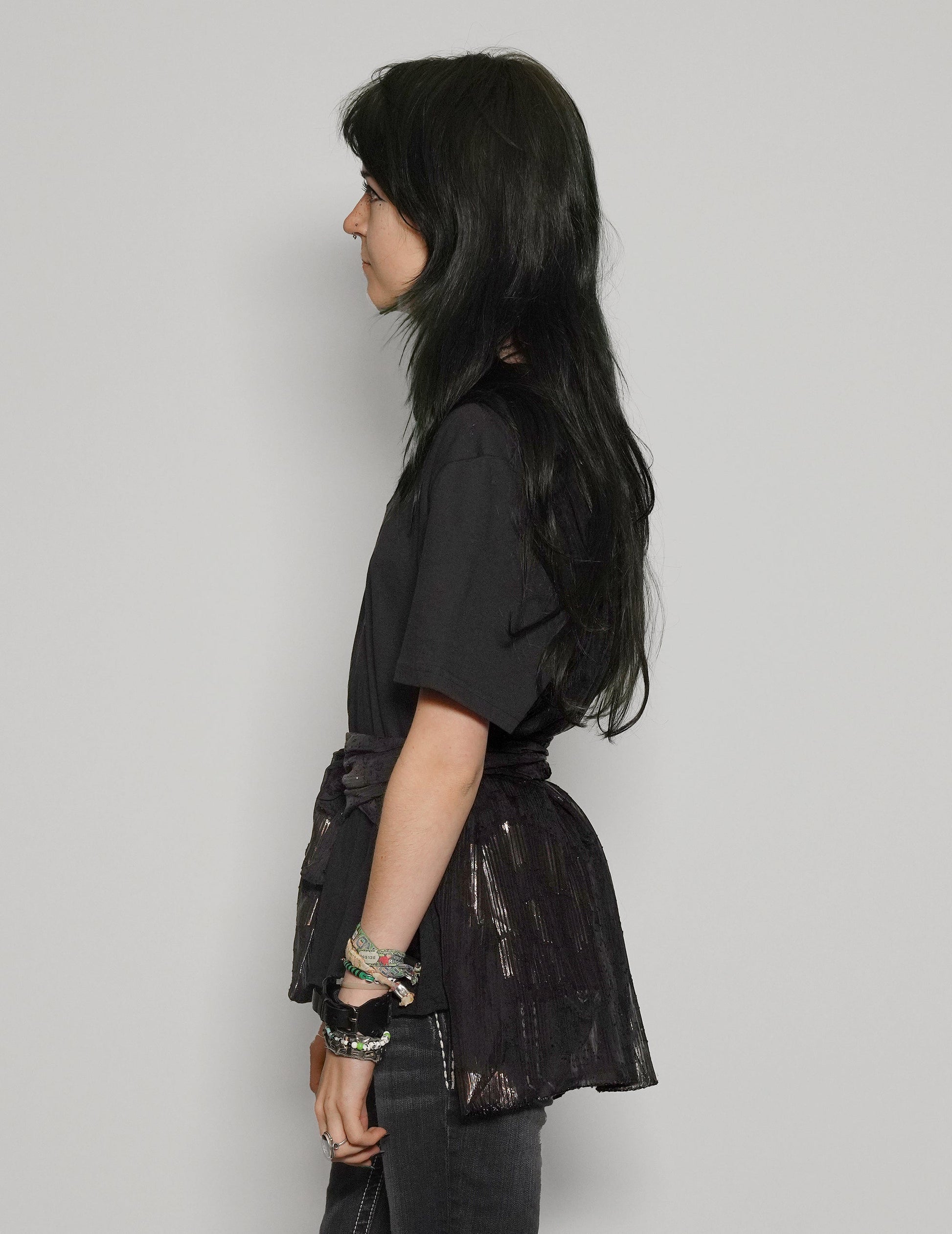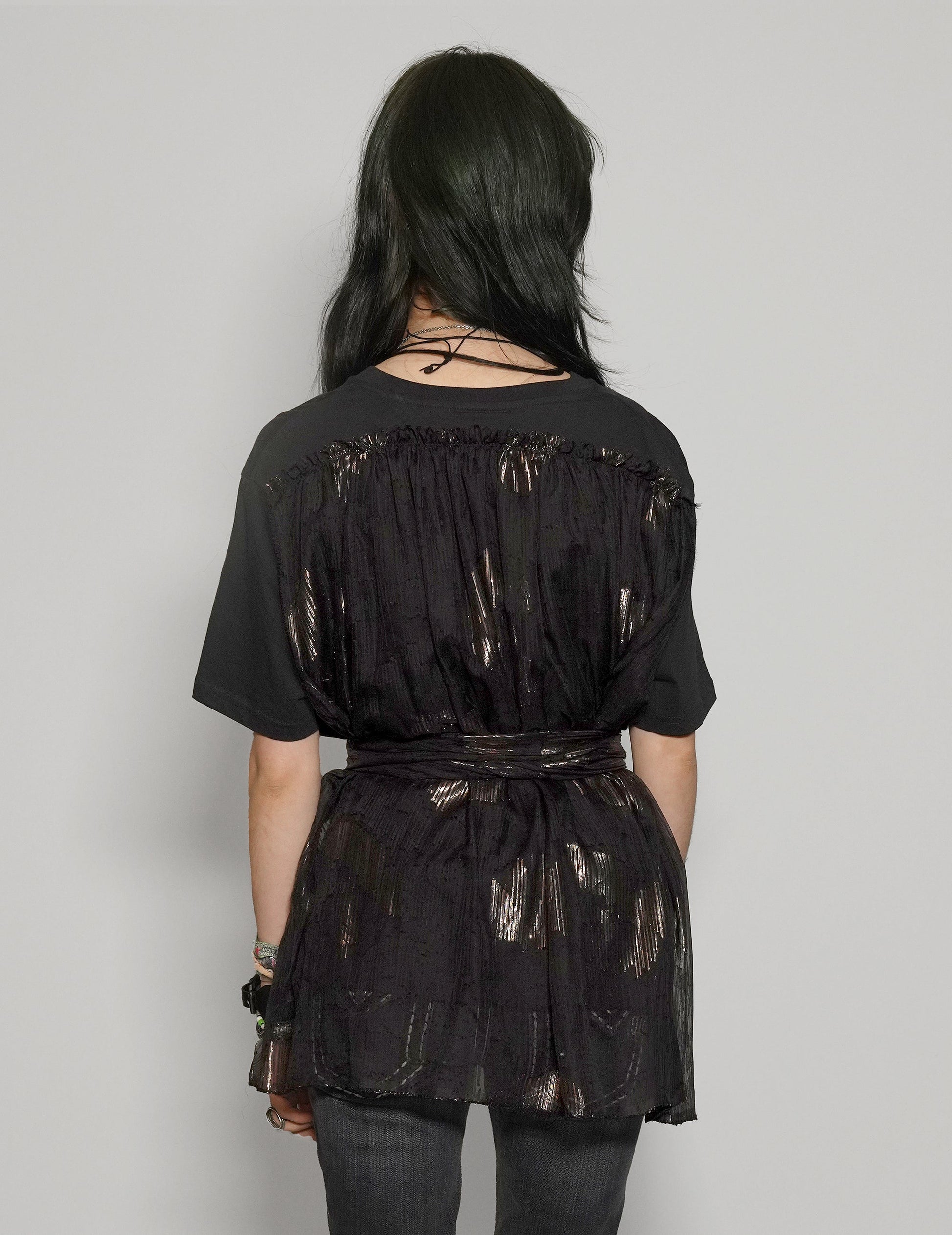 Women's cropped black t-shirt hand crafted in our East London Atelier m from soft, GOTS certified, 100% organic recycled cotton with relaxed fit, customised with an embroidered black and gold silk sequin party back and side tie with ST lined logo print on the front.