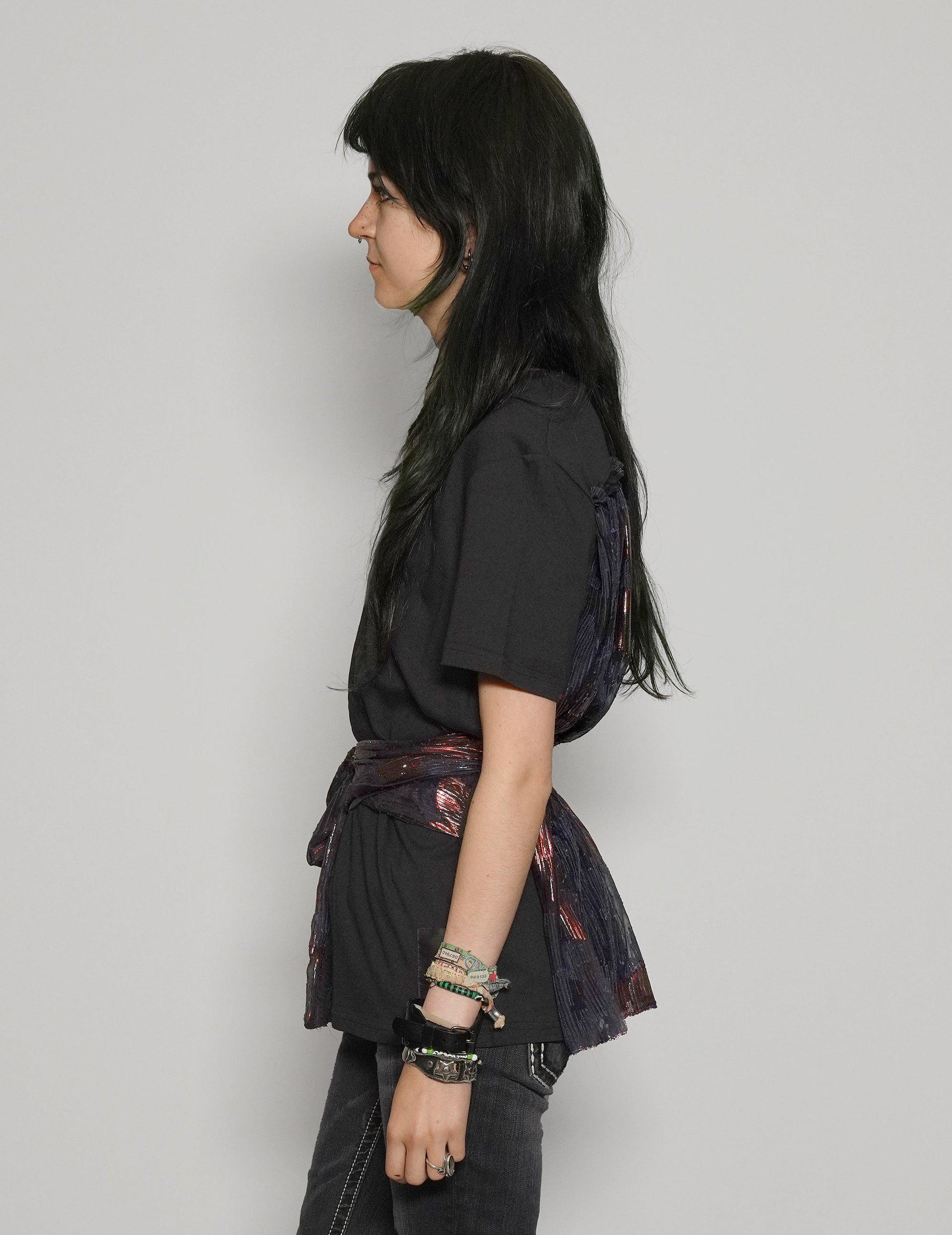 Women's cropped black t-shirt hand crafted in our East London Atelier from soft, GOTS certified, 100% organic recycled cotton with relaxed fit, customised with an embroidered blue and gold silk sequin party back and side tie with ST lined logo print on the front.