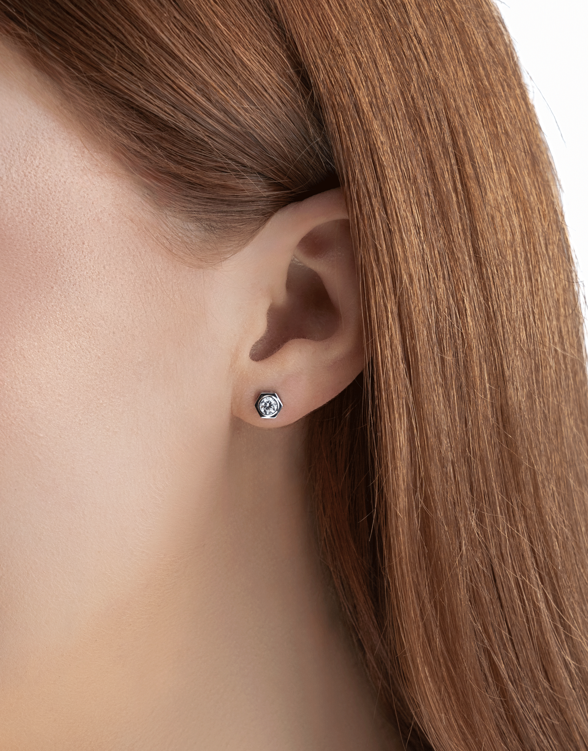 This earrings features a 0.20-carat moissanite (0.40 in total), renowned for its durability, superior brilliance and fire, even surpassing that of diamonds.