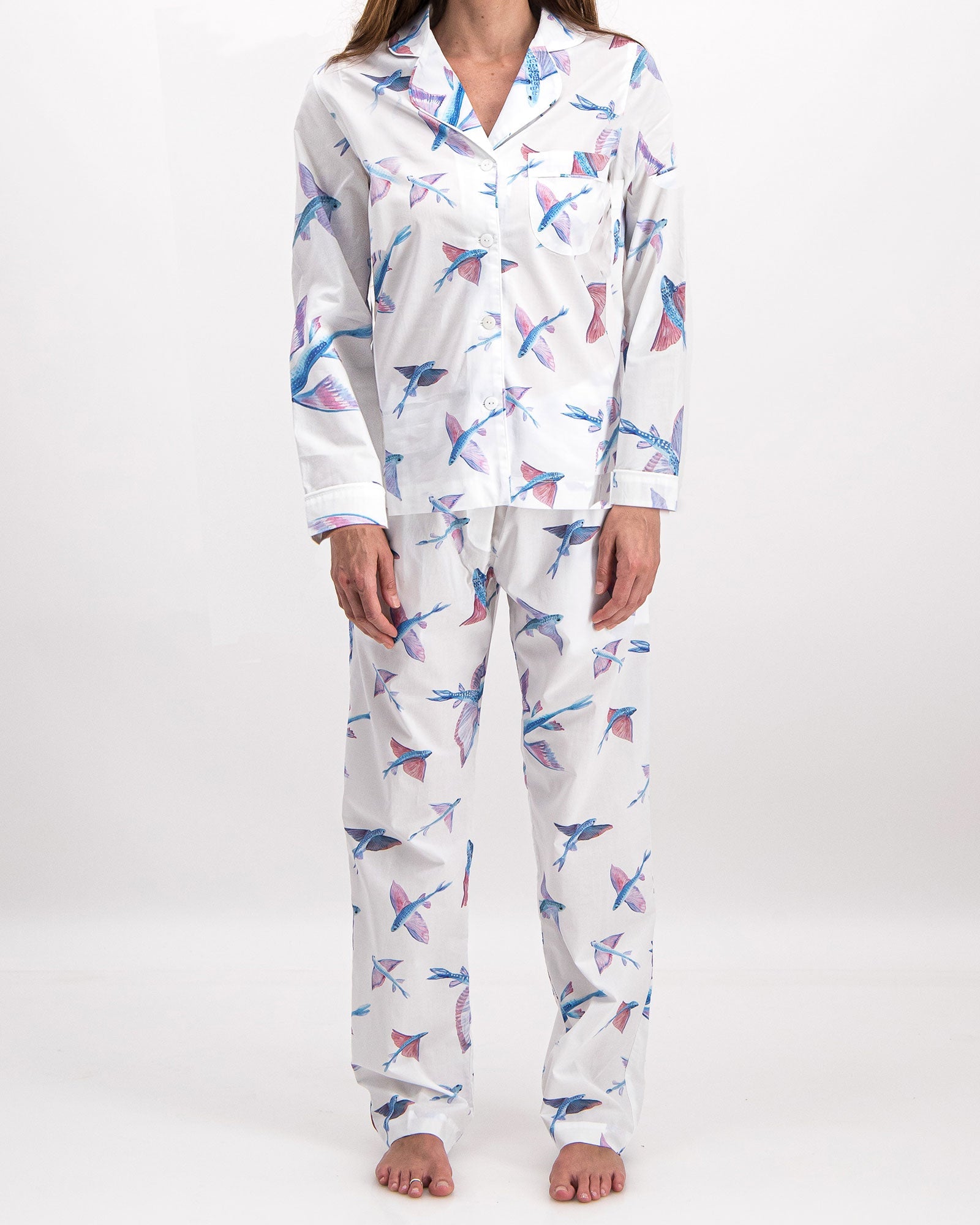 Handcrafted in 100% pure cotton, these women's pyjamas are the epitome of comfort, featuring hand-stitched piping on the rounded collars, pocket and cuffs.