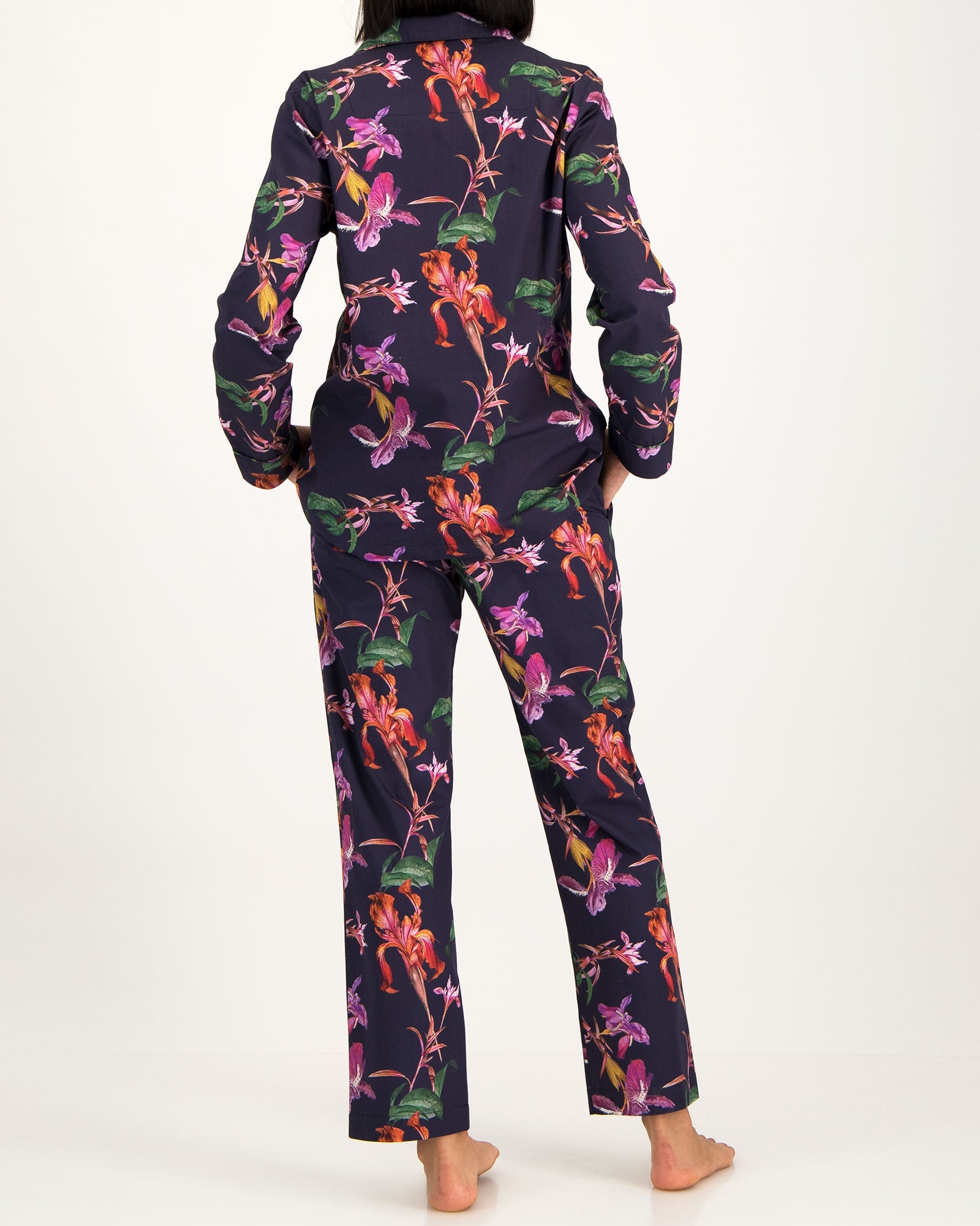 Handcrafted in 100% pure cotton, these women's pyjamas are the epitome of comfort, featuring hand-stitched piping on the rounded collars, pocket and cuffs. And you'll look as good as you feel in our beautifully feminine, but bold and modern, Iris Navy pattern.