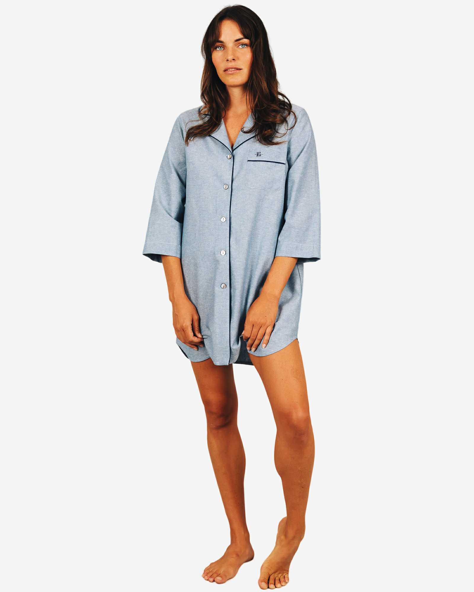 Our organic brushed flannel cotton women's sleep shirt is perfect for those long winter nights. Soft, snug and warm. The delicate handstitched blue piping adds style and elegance.