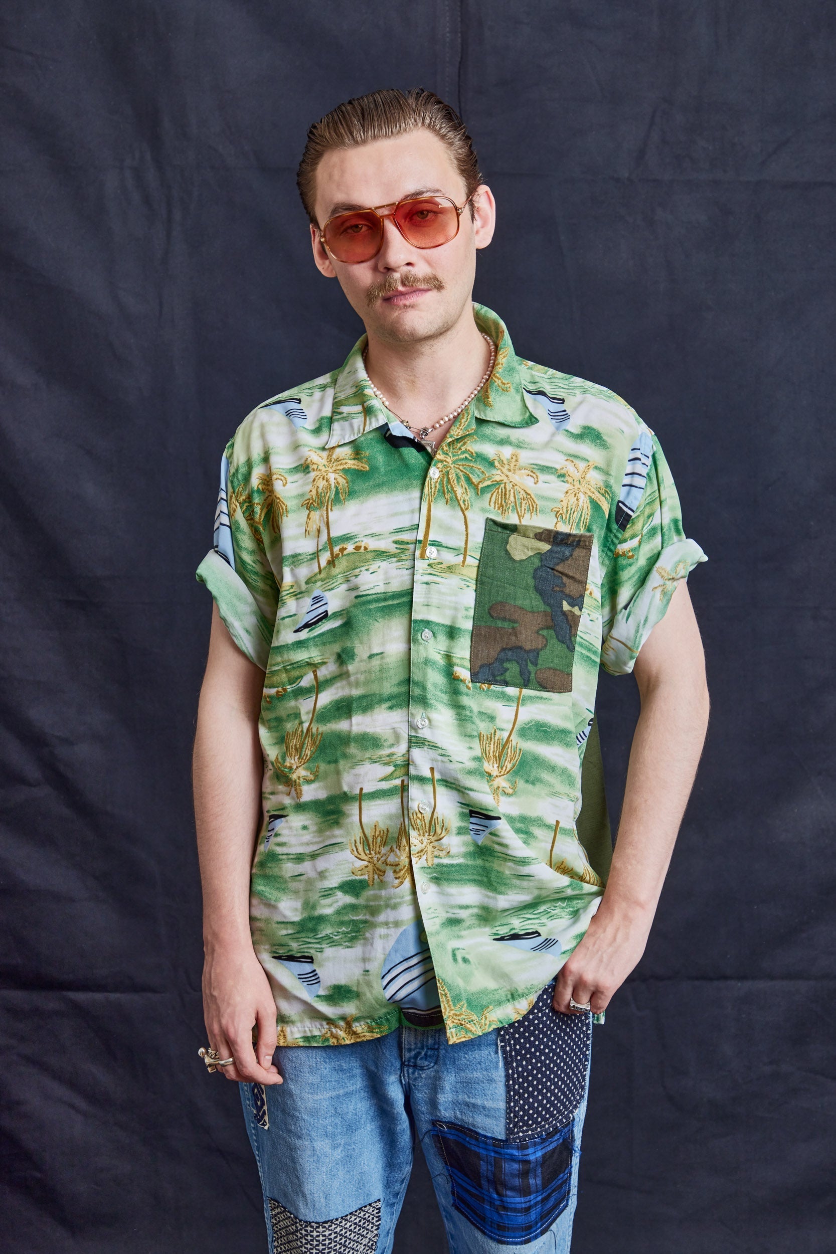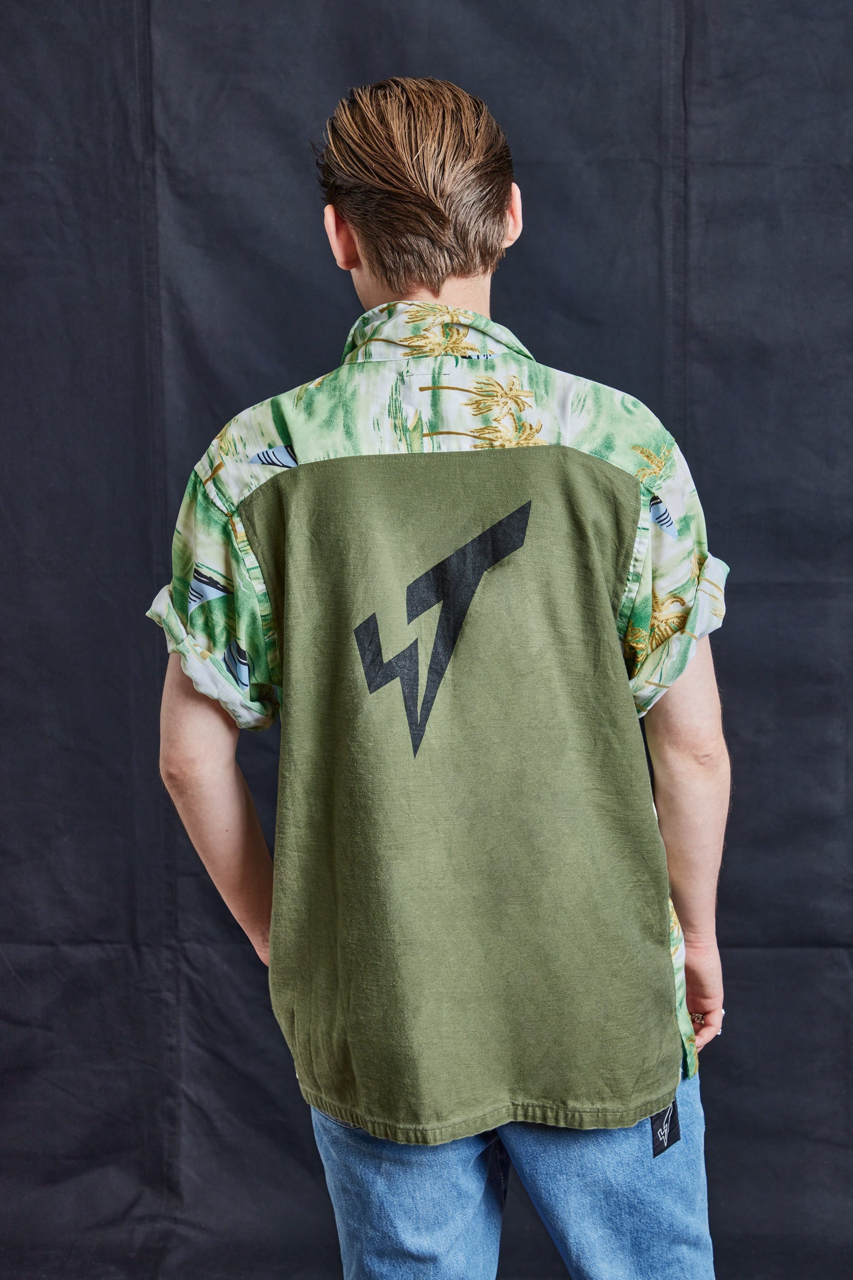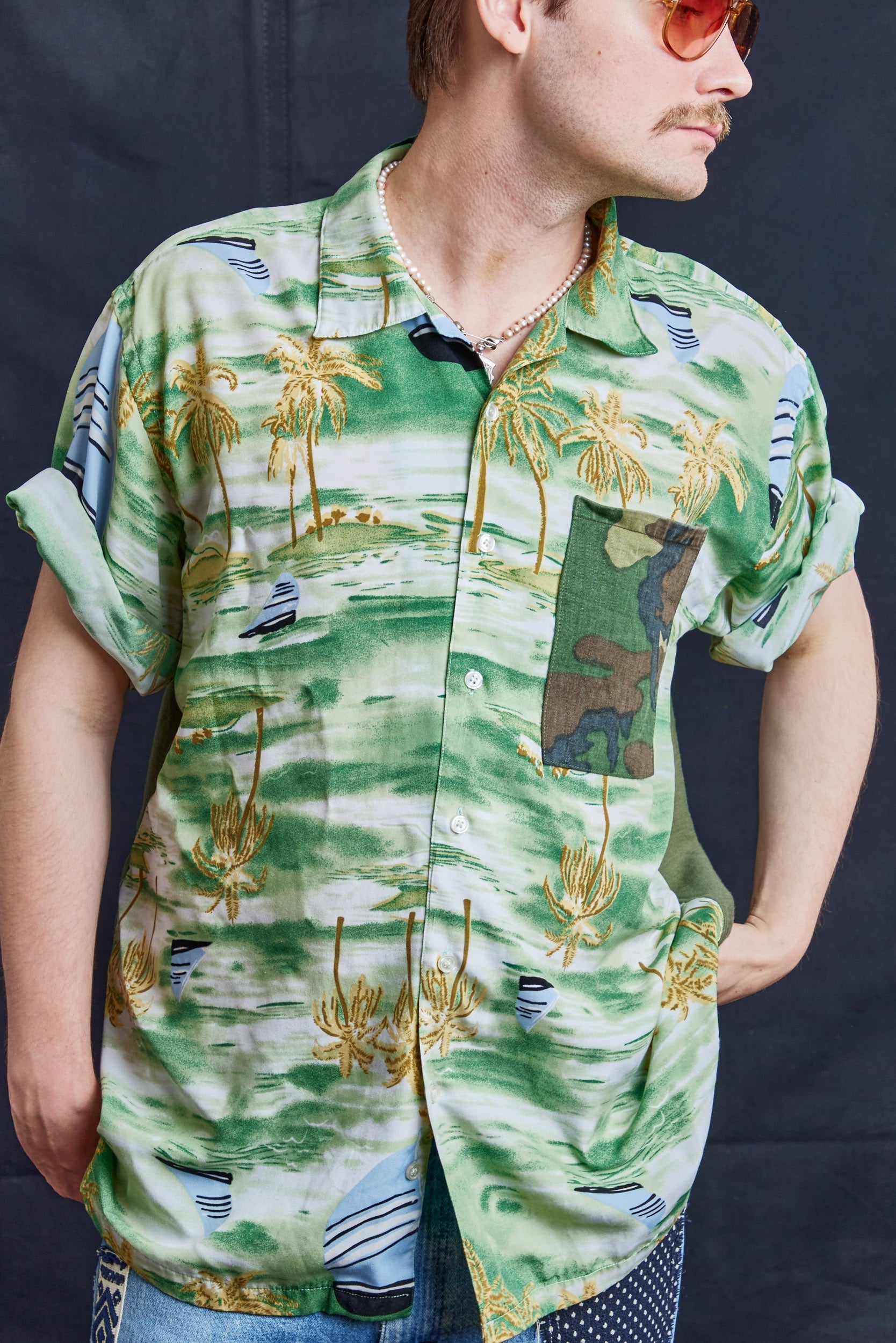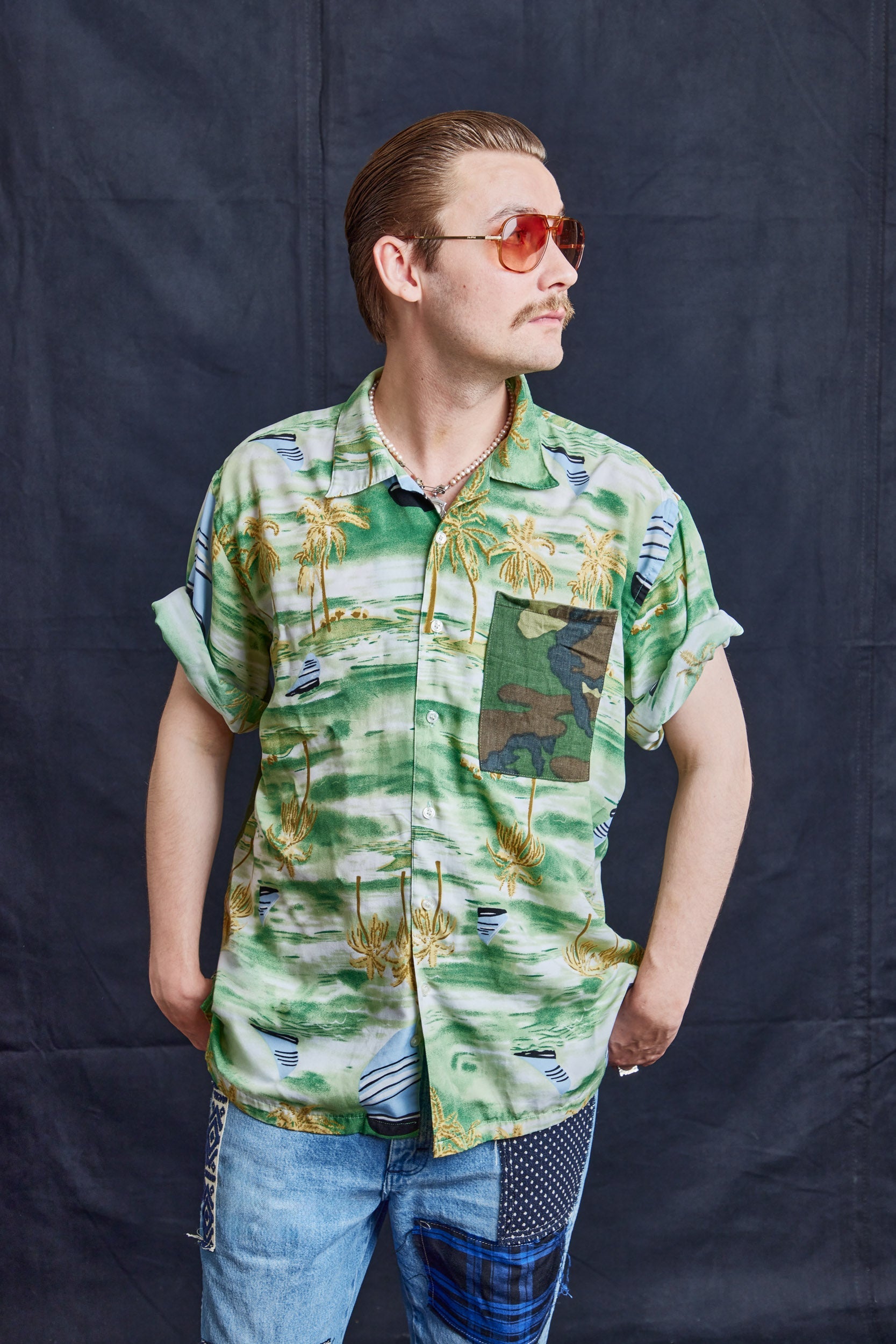 Original Vintage Hawaiian Shirt. 100% Cotton. Hand customised with US Woodland Camo breast pocket, and Vintage US Army Khaki Olive Green shirt back.