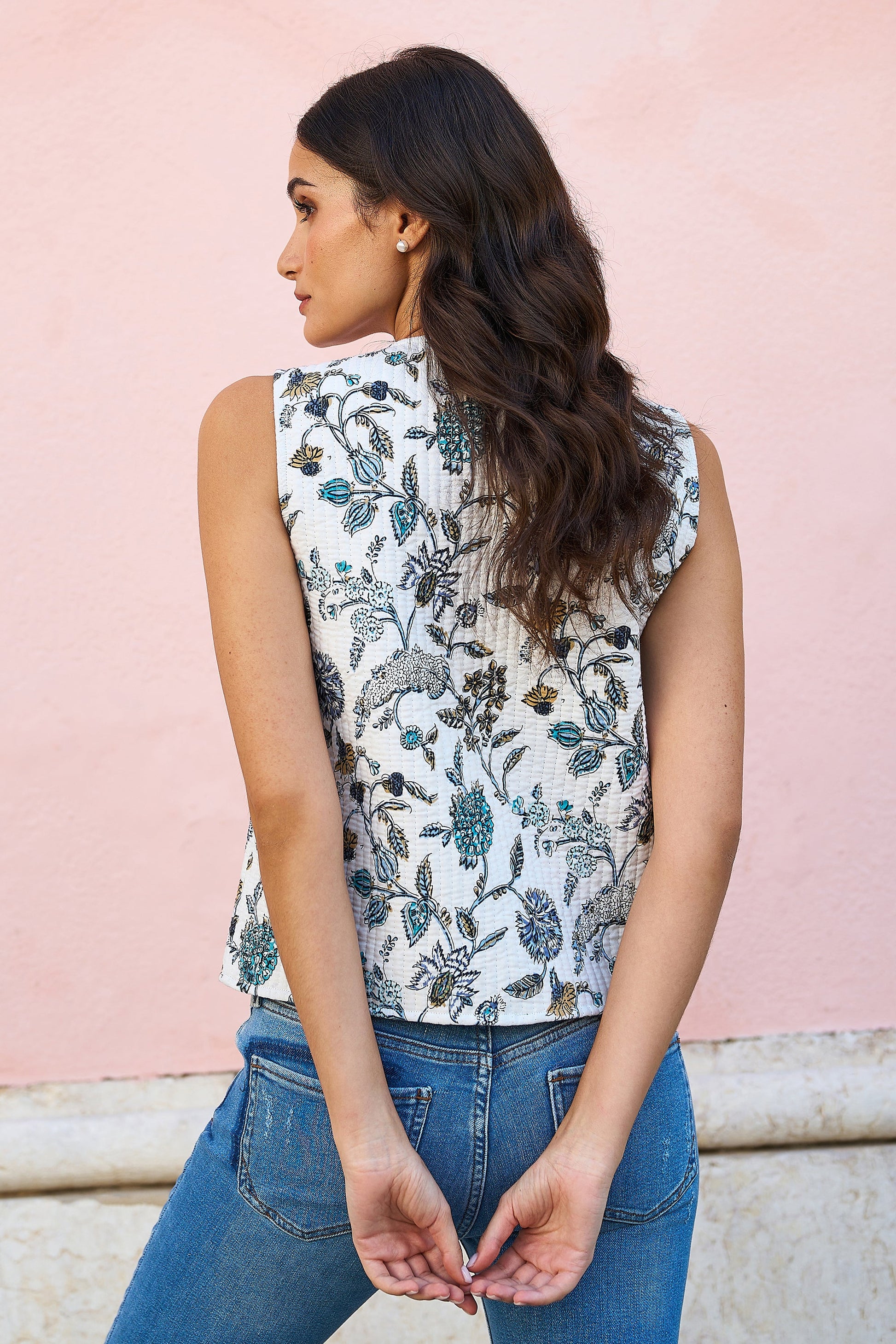 Yumi Blue Leaf Reversible Cotton Quilted Waistcoat