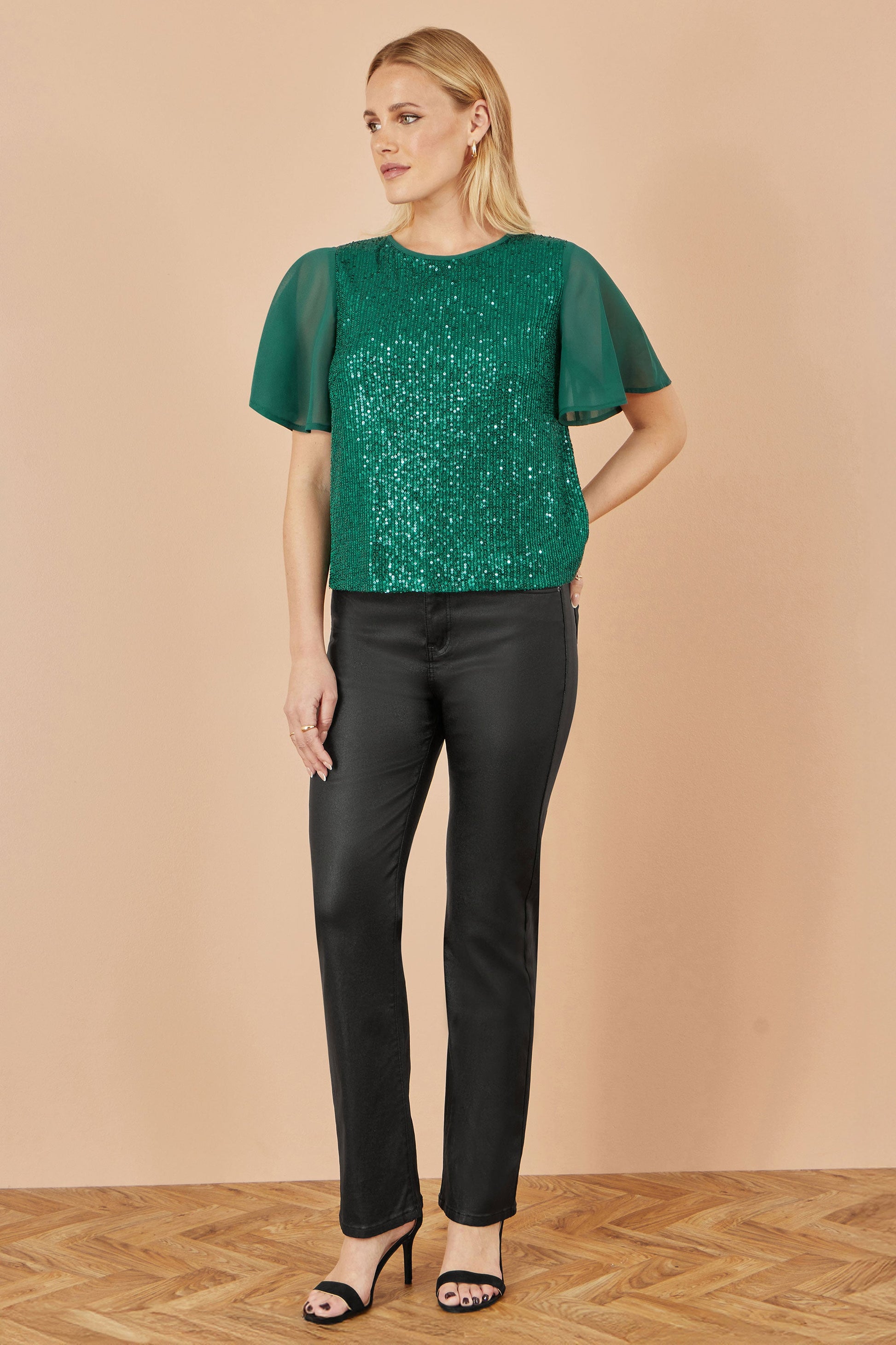 Yumi Green Sequin Top With Sheer Sleeves And Cut Out Back