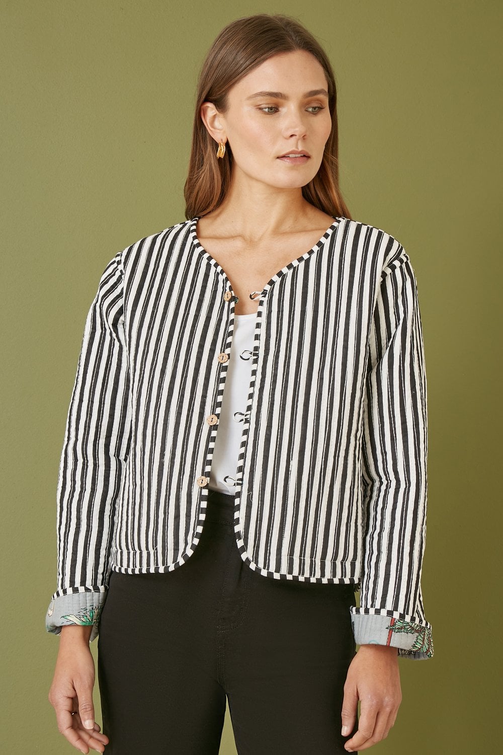 For bang on trend outerwear for the summer we love this grey cropped quilted jacket from Yumi. Made using a traditional quilting technique, from lightweight cotton, this reversible garment really is a show stopper. With a different unique print on the inside, the tags and care labels are sewn into the pockets so you can change your look easily. Pair with jeans and a T-shirt for an off duty look, or 2!