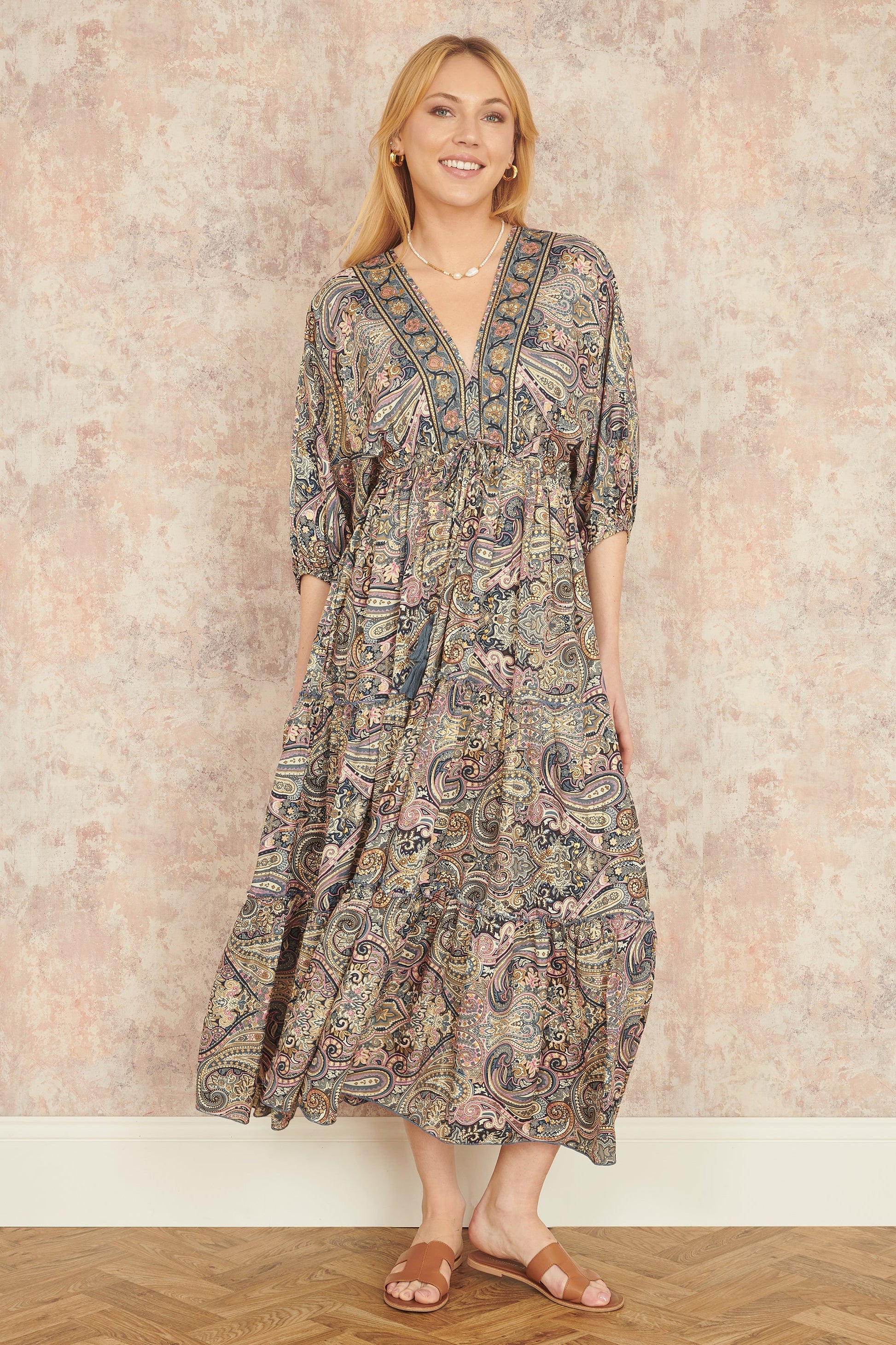This floaty and feminine dress from Yumi boasts a pretty paisley print and foil detailing throughout. With 3/4 sleeves, V neckline and a pretty tie in the back to add to the boho feel. The midi length hemline is flowy, perfect for wearing on holiday or to a fancy invite this summer.
