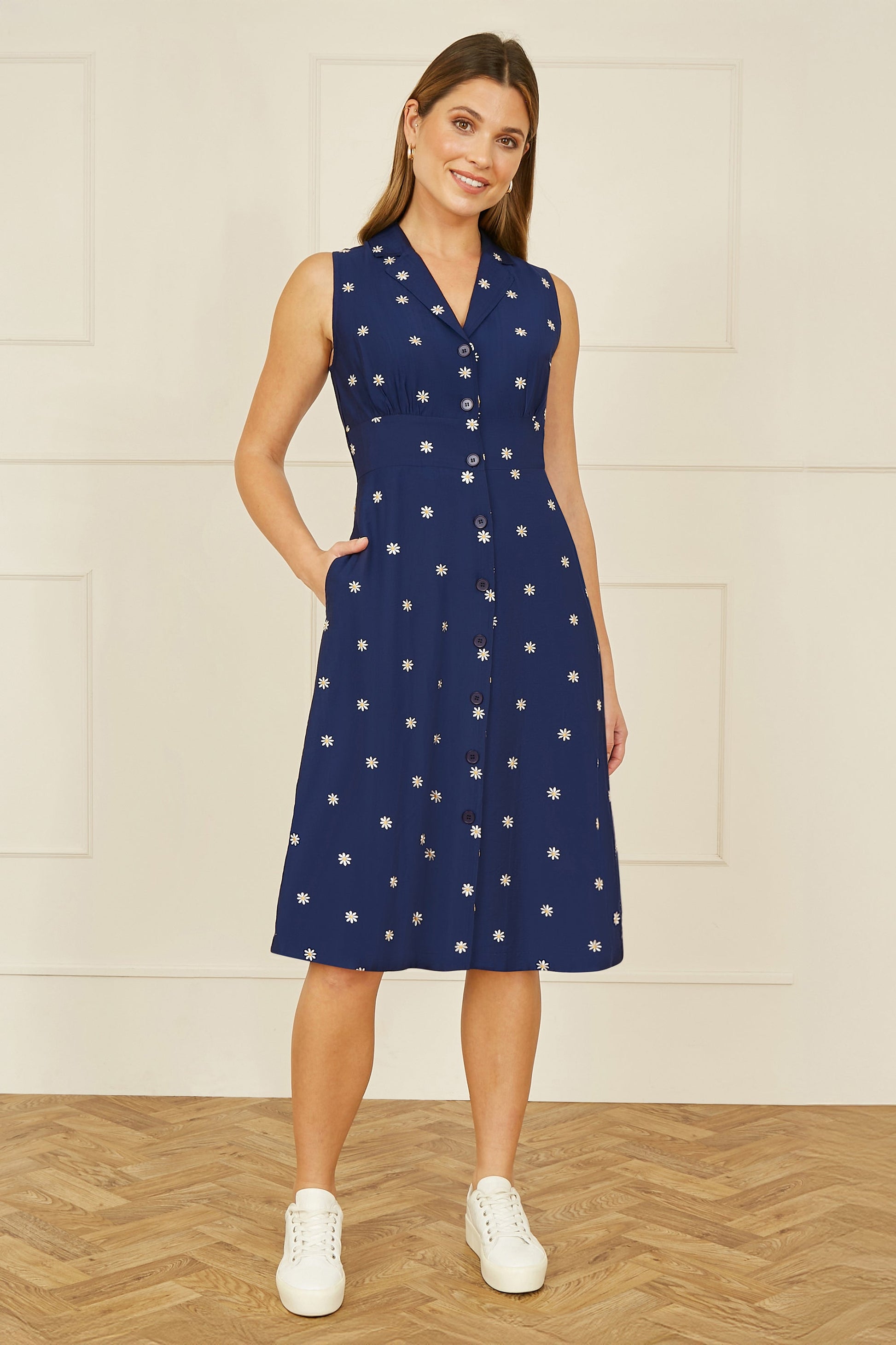 Yumi Navy Daisy Print Embroidered Sleeveless Shirt Dress